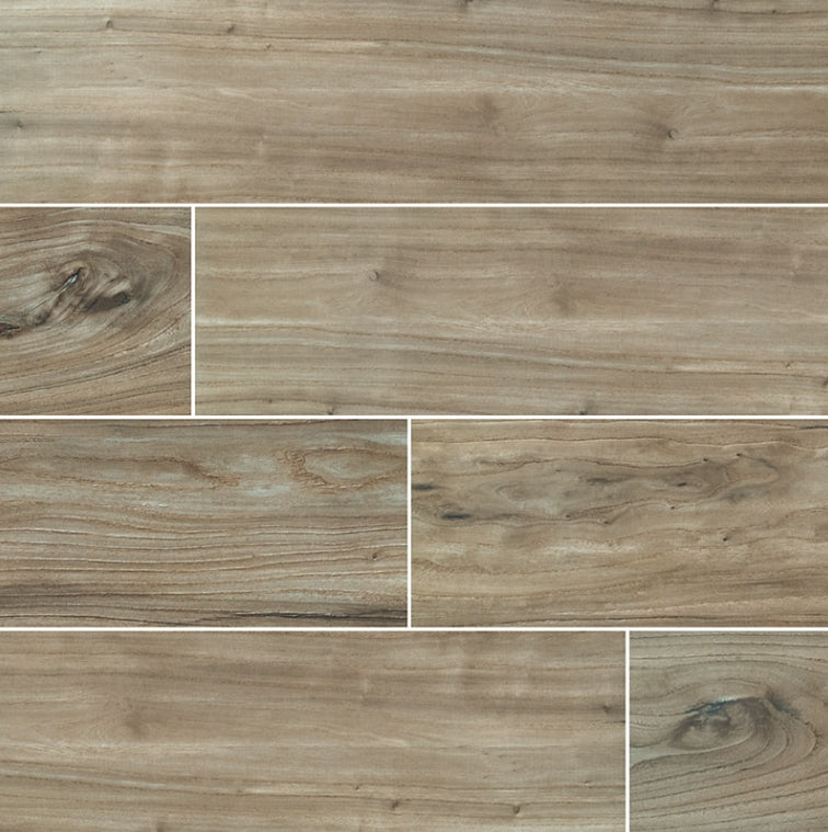 Teak Porcelain Wood Tile from the Catalina Collection is a fresh twist on a classic wood look, with lovely rich brown tones complemented by darker knots and graining. In a sophisticated polished finish, this affordable rectified wood look tile is modern minimalism at its best. Highly versatile, Catalina Teak can be used on floors, walls, backsplash, accent walls, and residential countertops. Durable, easy to clean, and low maintenance, it’s the perfect porcelain tile for kitchens, baths, mudrooms, living areas, and more. Create a cohesive look throughout your space with this warm wood look tile that pairs easily with many MSI products.