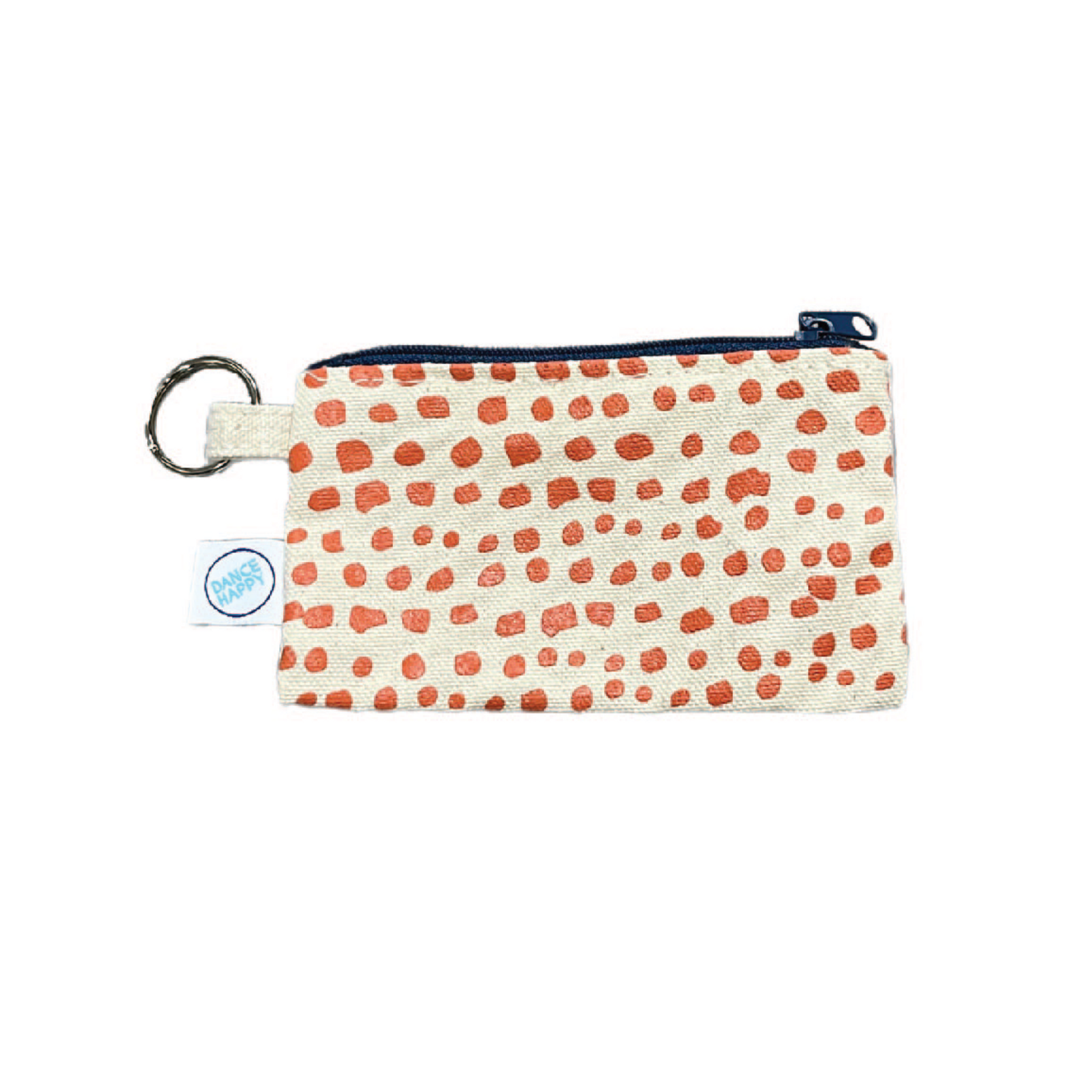 Darling cardholder with "Celebrate Differences" on one side and a bold pattern on the other, both screenprinted in brick. The perfect size to fit your cards, some cash, and attach your keys without taking up a lot of room in your bag. Metal keyring and dark navy colored zipper.