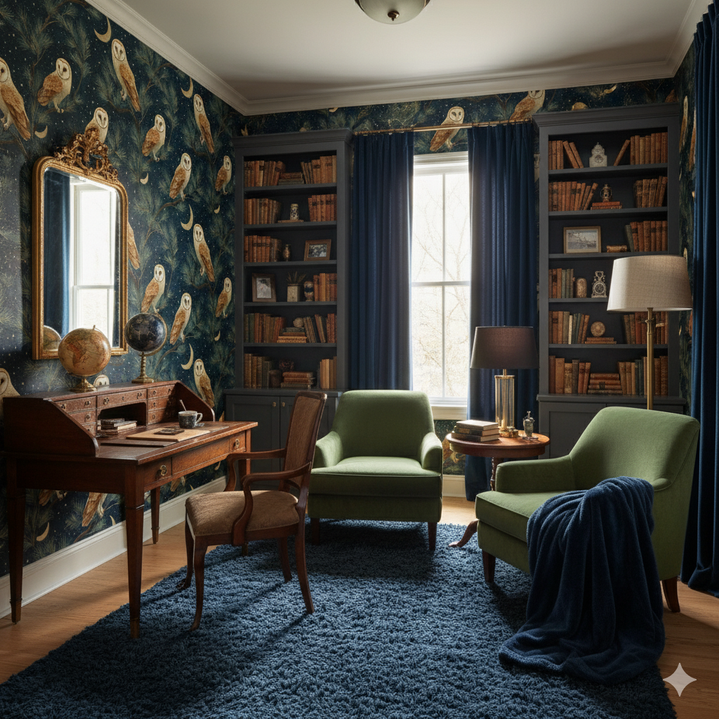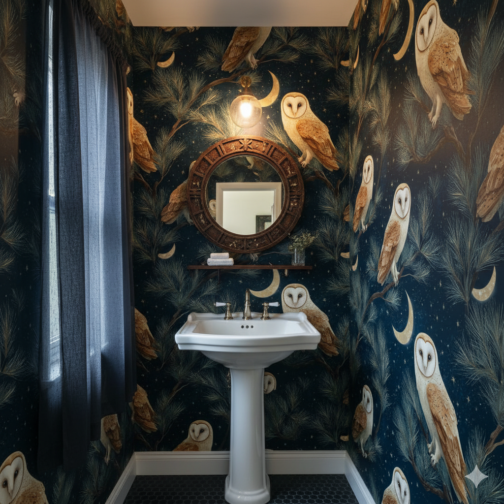 Golden-feathered barn owls perch on pine branches under a midnight sky dotted with stars and crescent moons. The design balances mystery and warmth, with the owls’ piercing eyes glowing against the deep navy backdrop. Celestial Roost is an enchanting choice for children’s rooms, reading nooks, or whimsical interiors where storytelling and atmosphere matter. When paired with brass lamps, star-shaped accents, or dark velvet upholstery, it creates a dreamy and slightly mystical environment that feels both comforting and otherworldly.
