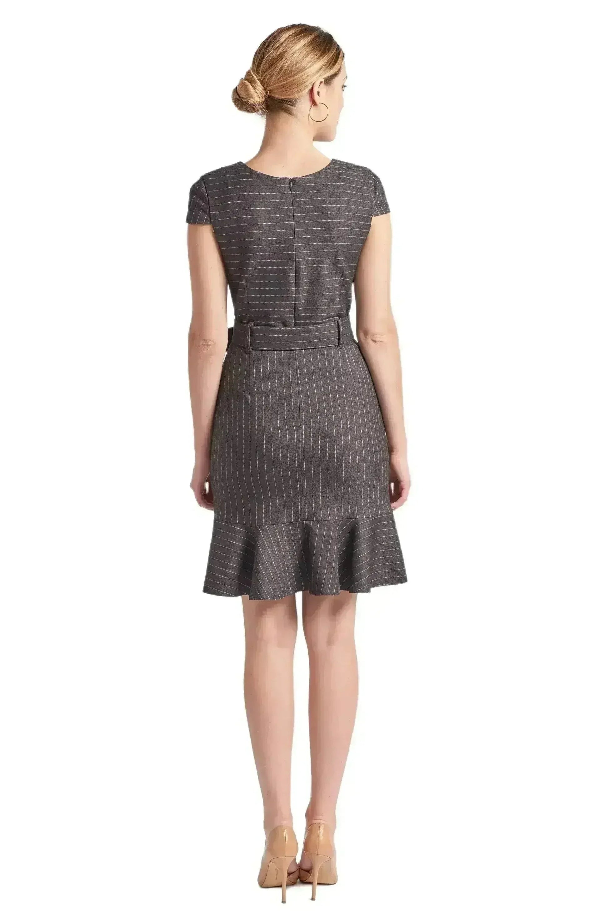 Our Chelsea dress is our take on the men's classic pinstripe morphed into a feminine silhouette. With multi-directional stripes that keeps it interesting yet classic, cap sleeves, a self belt, and ruffle hem, this dress is a one and done look! Our Chelsea dress can make you a power player at work and a fierce maven for happy hour. Style it your way with grey or nude pumps!