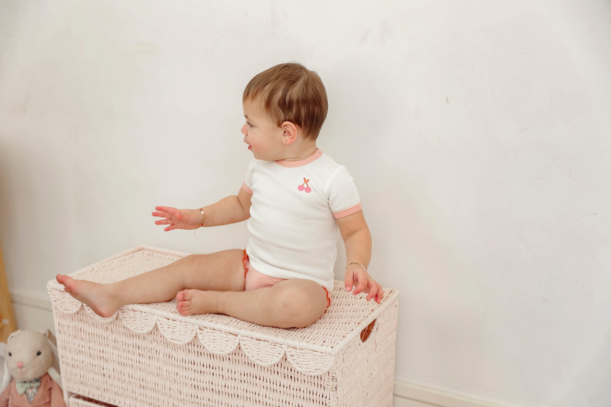 Baby girls ribbed 2 piece set. Short sleeve top with left side chest cherry embroidery. Matching bottom with covered elastic waistband and ruffle at leg opening. ֲ