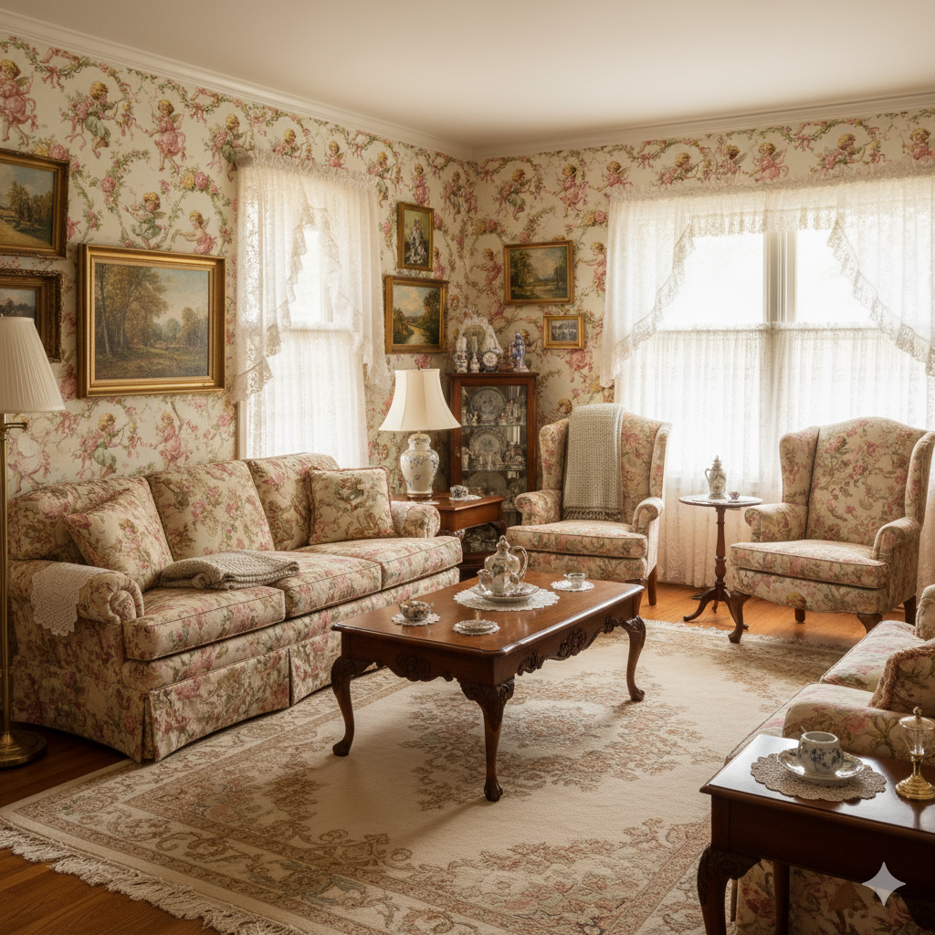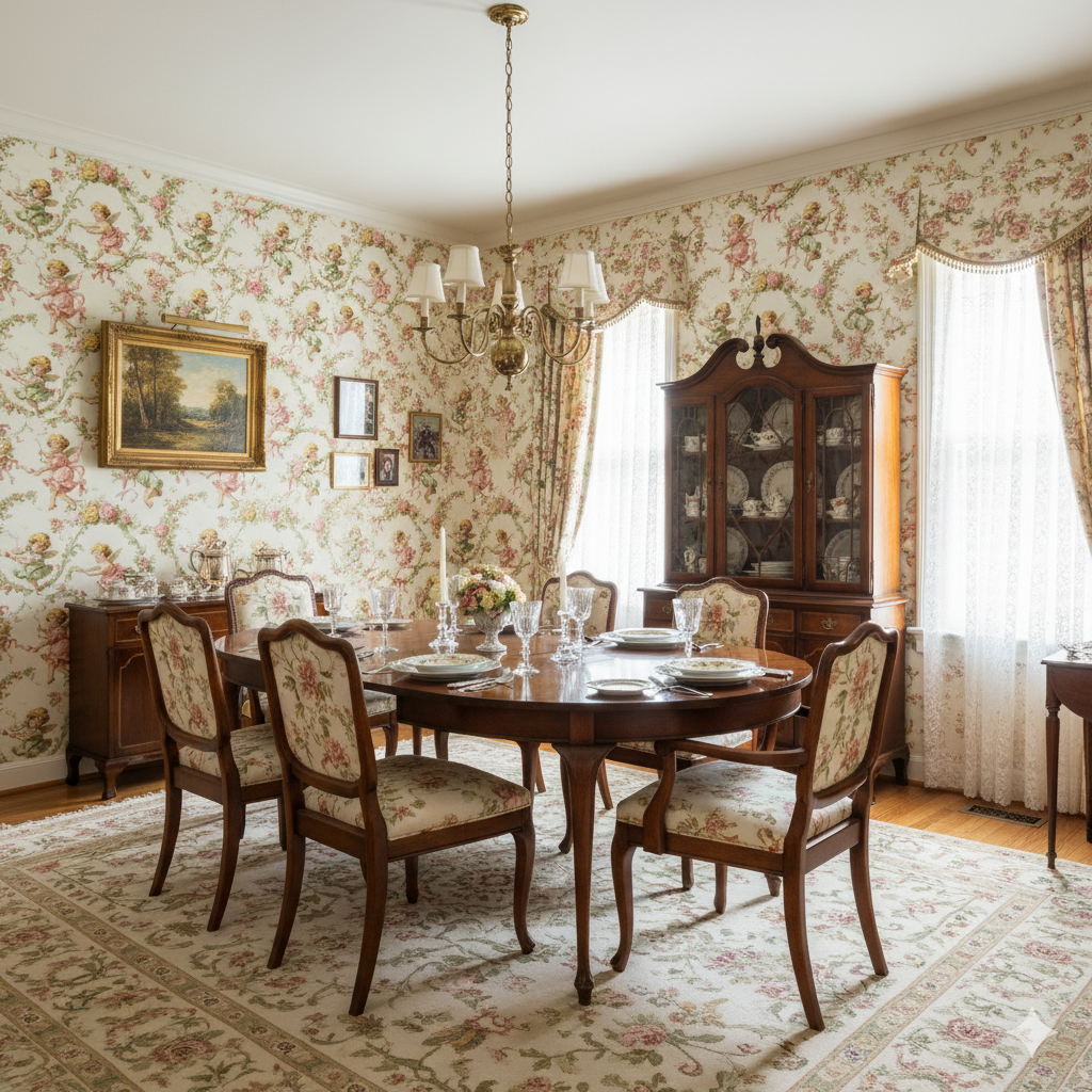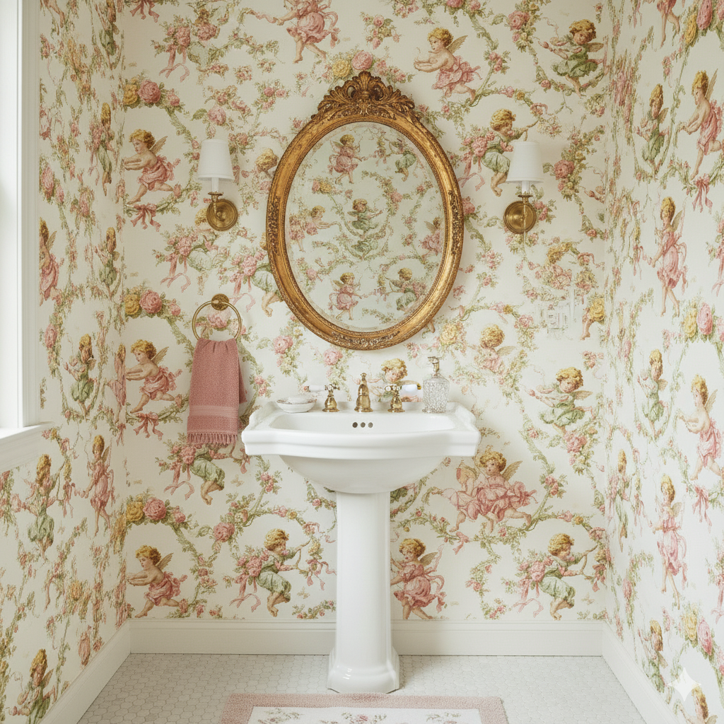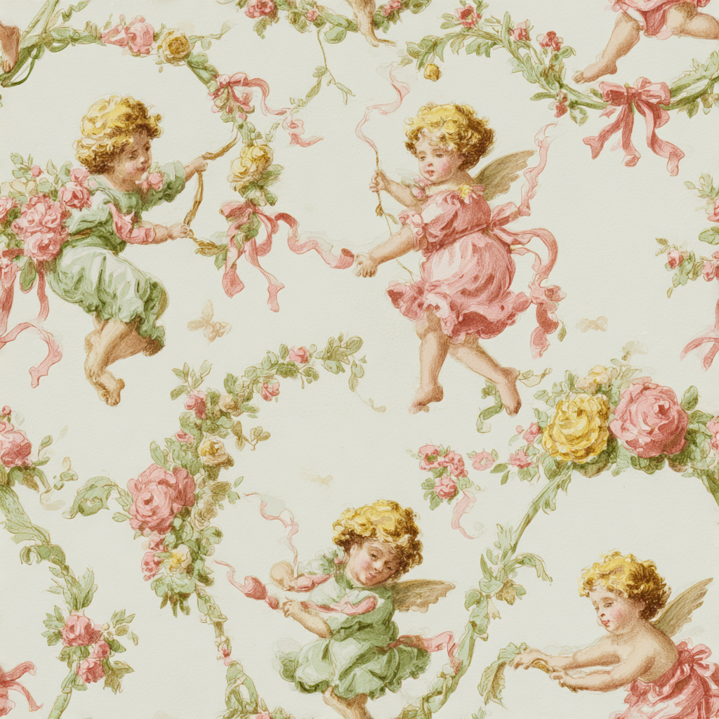 Playful cherubs dressed in pastel garments float among roses, ribbons, and garlands. The Rococo spirit is alive here, whimsical and ornate, yet charmingly lighthearted. Pink, yellow, and green tones pop against an ivory ground, with hand-painted detailing that gives it the softness of a historic fresco. This design is made for spaces that want to embrace romance and nostalgia — think Parisian patisseries, ornate powder rooms, or a feminine boutique interior. Though steeped in 18th-century aesthetics, it feels almost surreal when installed in a modern space, creating a delightful visual tension.
