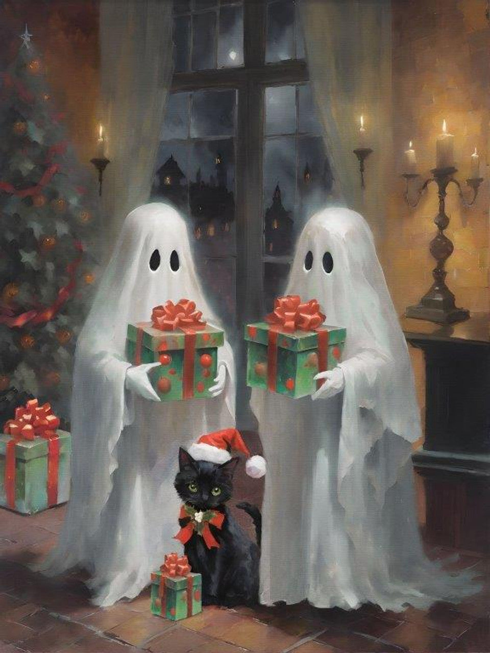 This picture is called "Spirit of Giving". The print unframed measures 12x16 inches. The frame will add about one more inch per side. Beautiful print with multiple frame selections to choose from. In this whimsical Christmas Eve picture two friendly ghosts float cheerfully, each holding a vibrant gift box wrapped in festive red and cheerful green, both adorned with large, shiny bows. Between them sits an adorable black cat, its sleek fur contrasting beautifully with a bright red bow and a playful Santa hat perched atop its head. The room is softly illuminated by flickering candlelight, casting warm shadows and creating a cozy atmosphere, while the gentle glow of moonlight filters through the window, enhancing the magical feel of the scene. Choose your lath frame color to customize your product. All frames have a vintage wire along the top of the frame for quick hanging.