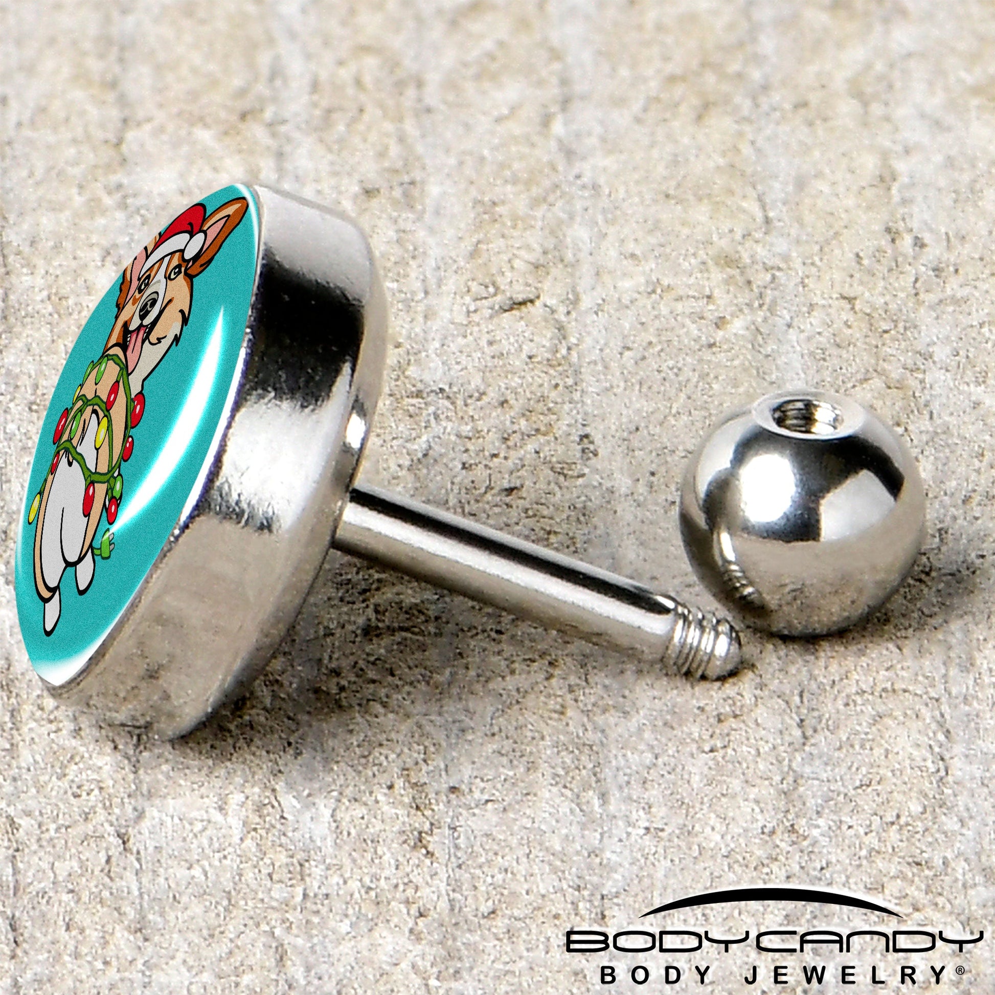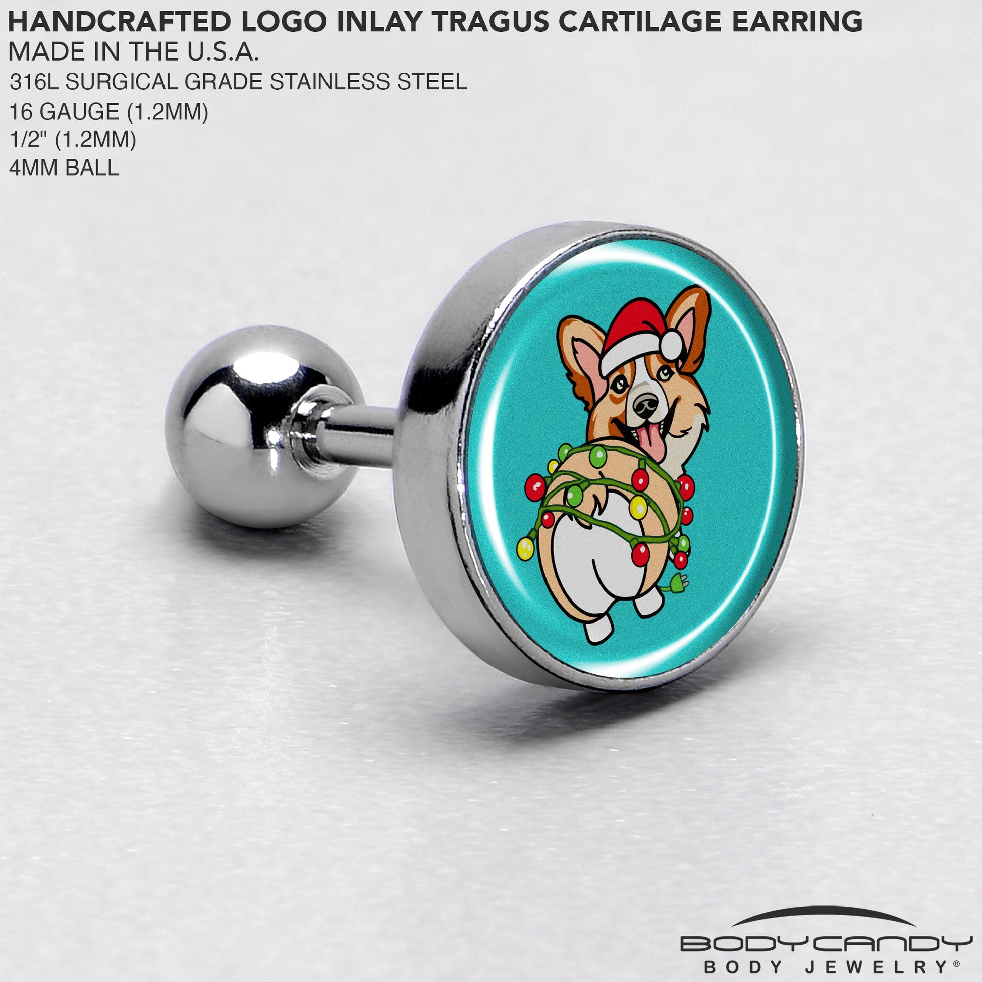 Celebrate the holidays in style with this festive Christmas Holiday Lights Corgi Dog tragus stud! Featuring adorable, artist hand-drawn artwork of a cheerful corgi wrapped in twinkling holiday lights, this unique design adds a touch of holiday cheer to your look. Crafted from high-quality materials, this 16 gauge cartilage ring is hypoallergenic, ensuring comfort and safety for sensitive skin. Each piece is thoughtfully hand-assembled in the USA, making it a perfect choice for anyone who loves supporting local artistry. Embrace the season with this charming holiday-inspired cartilage jewelry!