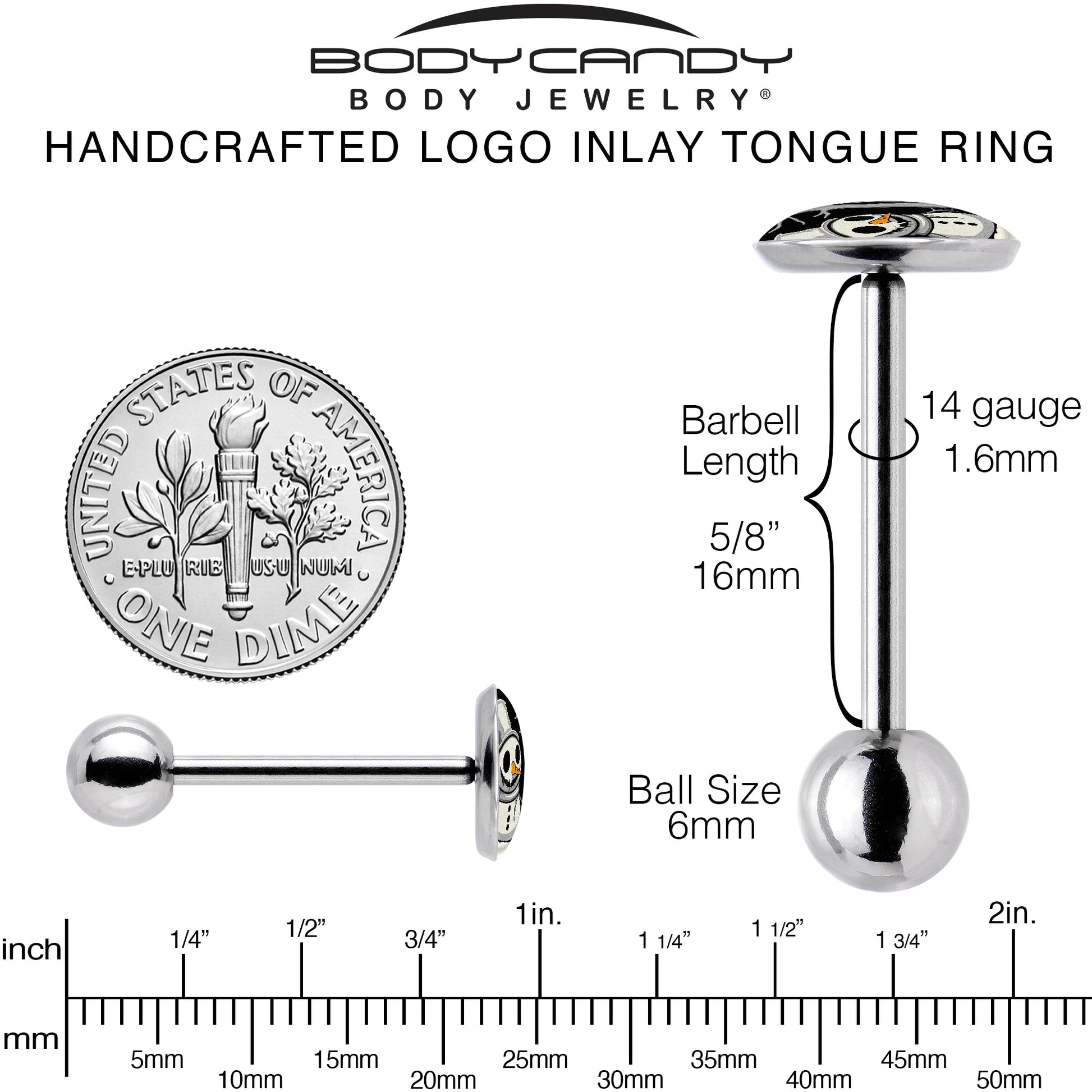 14 Gauge (1.6mm), 5/8" (16mm), 9mm Logo Inlay, 316L Surgical Grade Stainless Steel, 6mm Ball