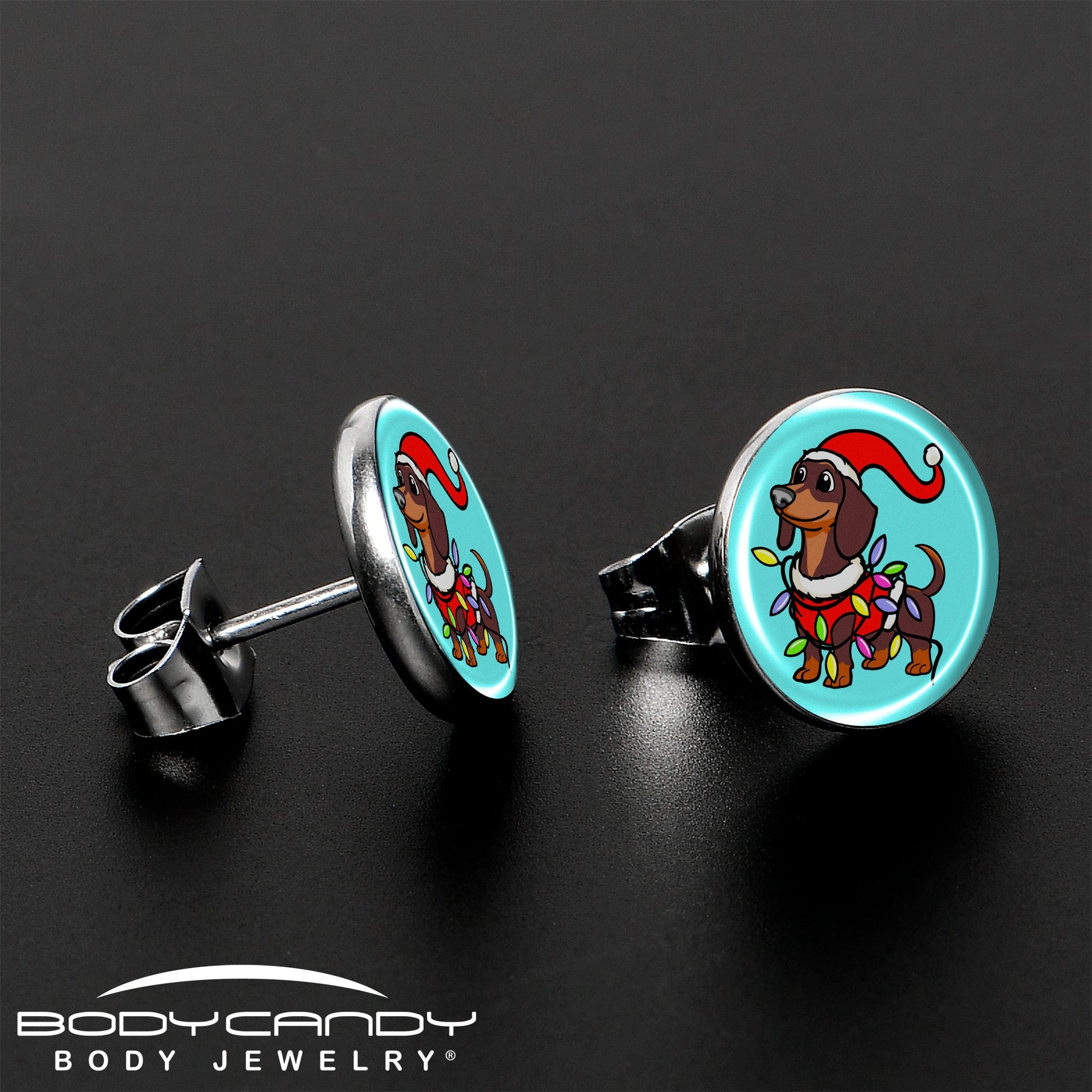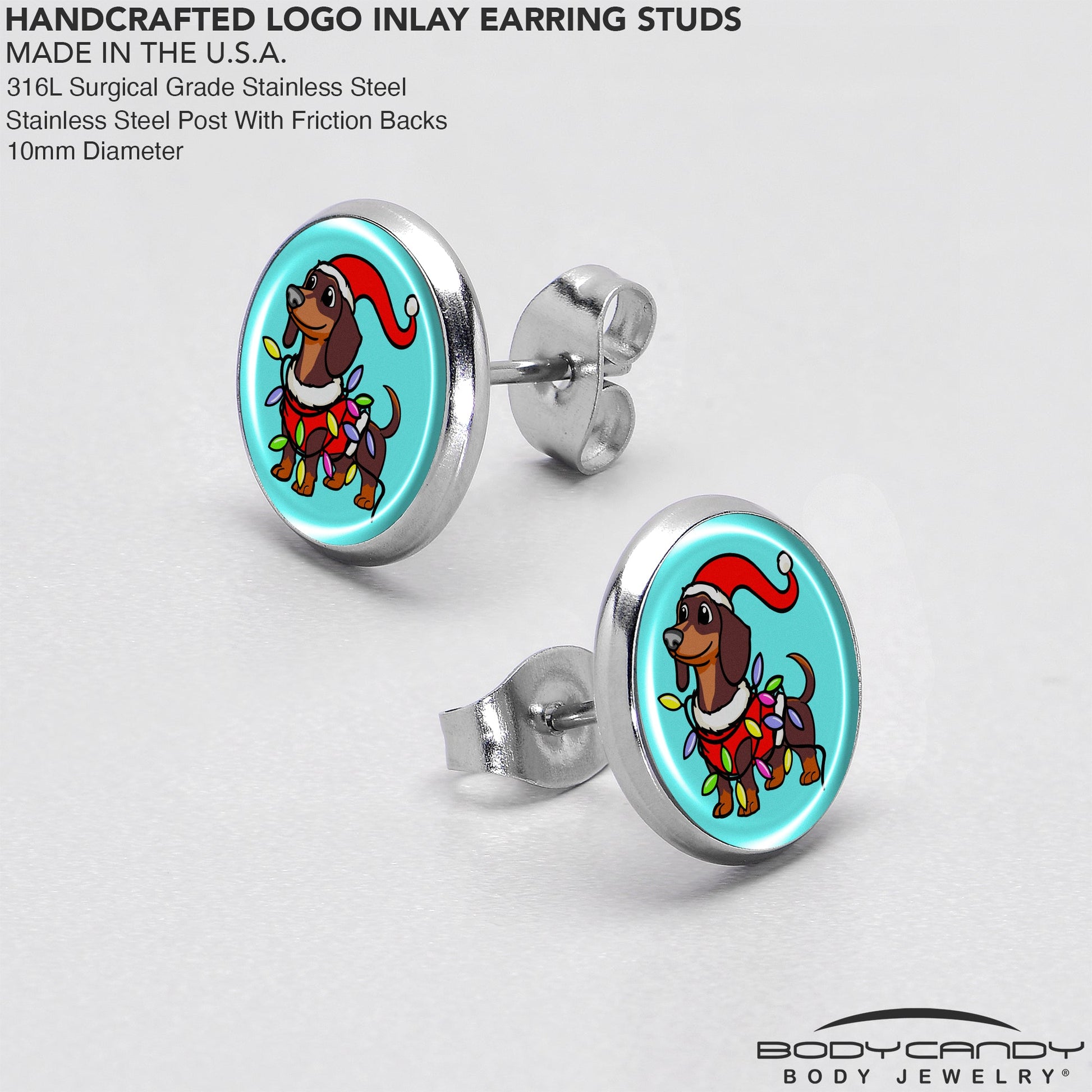 Spread holiday cheer with these adorable Christmas-themed wiener dog earrings! Crafted from high-quality, hypoallergenic materials, these stud earrings are both stylish and skin-friendly. The artist hand-drawn artwork features a playful dachshund decked out in festive attire, making it the perfect accessory for any dog lover or holiday enthusiast. Each piece is hand-assembled in the USA with care, ensuring a unique touch for your collection. Celebrate the season with these charming, lightweight, and comfortable piece that will make your ear lobes shine!