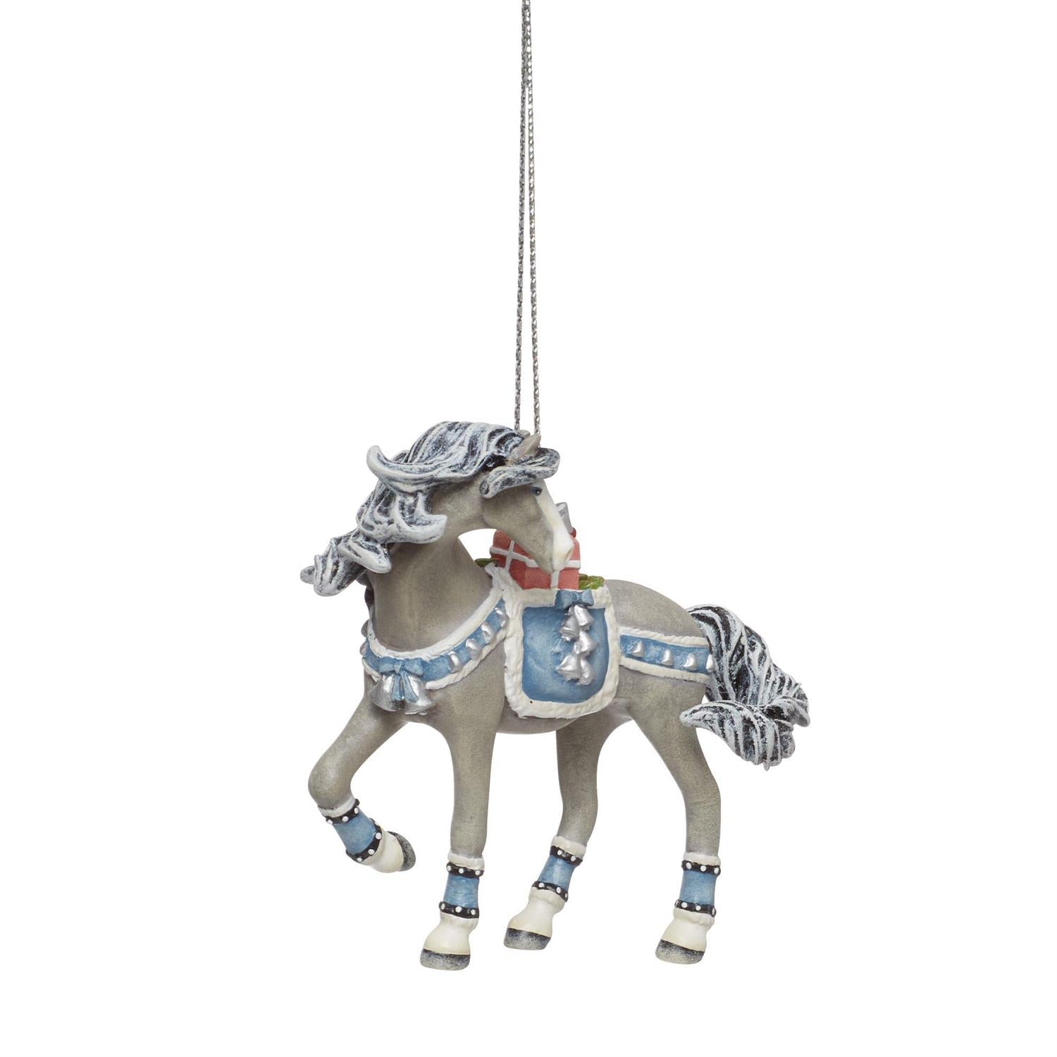 The horse is decorated with a blue and white saddle blanket accented by delicate silver bells and a festive holly sprig. Perched atop the blanket are beautifully wrapped gifts, symbolizing the joy of giving during the holiday season. The horse's flowing mane and tail, carefully sculpted to convey movement, are adorned with a dusting of sparkling "snow," adding to the wintry theme. The horse's leg wraps and bridle also feature festive blue and silver accents, completing its stylish holiday ensemble.