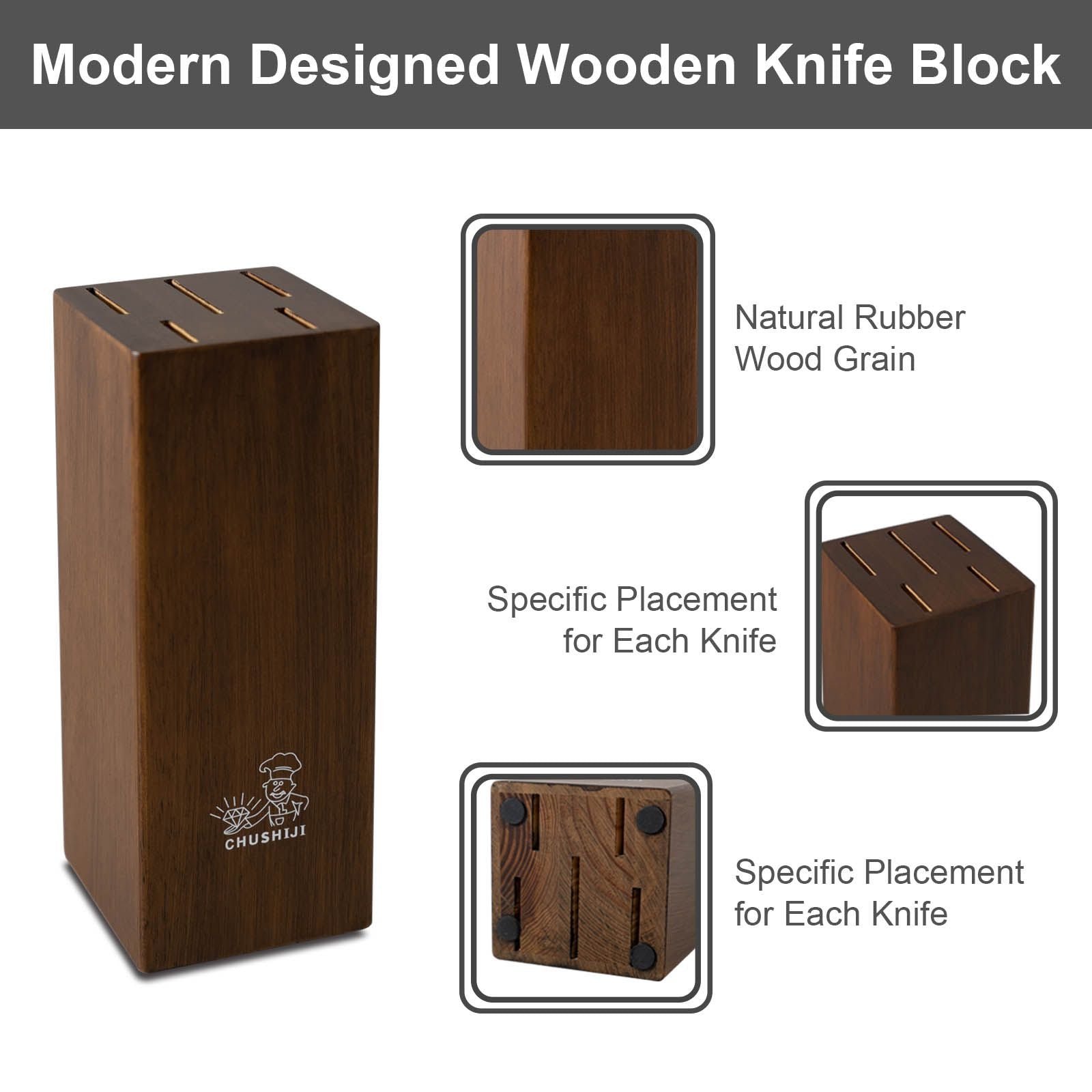 [MODERN DESIGNED WOODEN KNIFE BLOCK]Made of natural rubber wood; CHUSHIJI's block with knife set features more solid and more durable block; specific position for each knife and a non-slip breathable bottom.