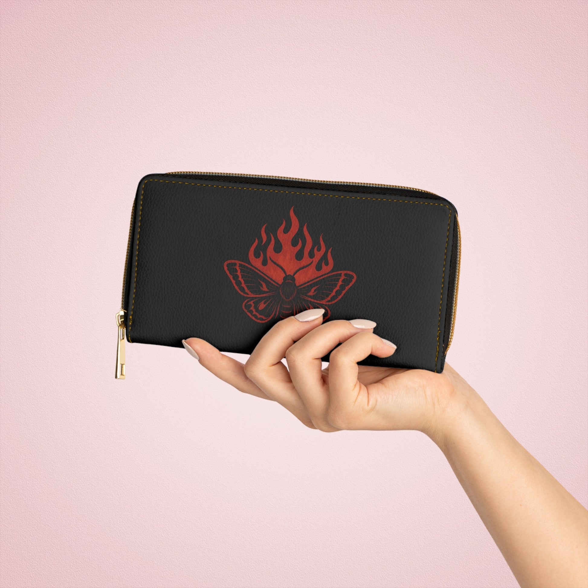 The Cinderflight Wallet carries fire in your hand. A gothic moth spreads ember-lit wings across crimson and shadow, turning a simple wallet into a symbol of defiance. Compact but commanding, it’s stitched for chaos queens who carry their flame everywhere.