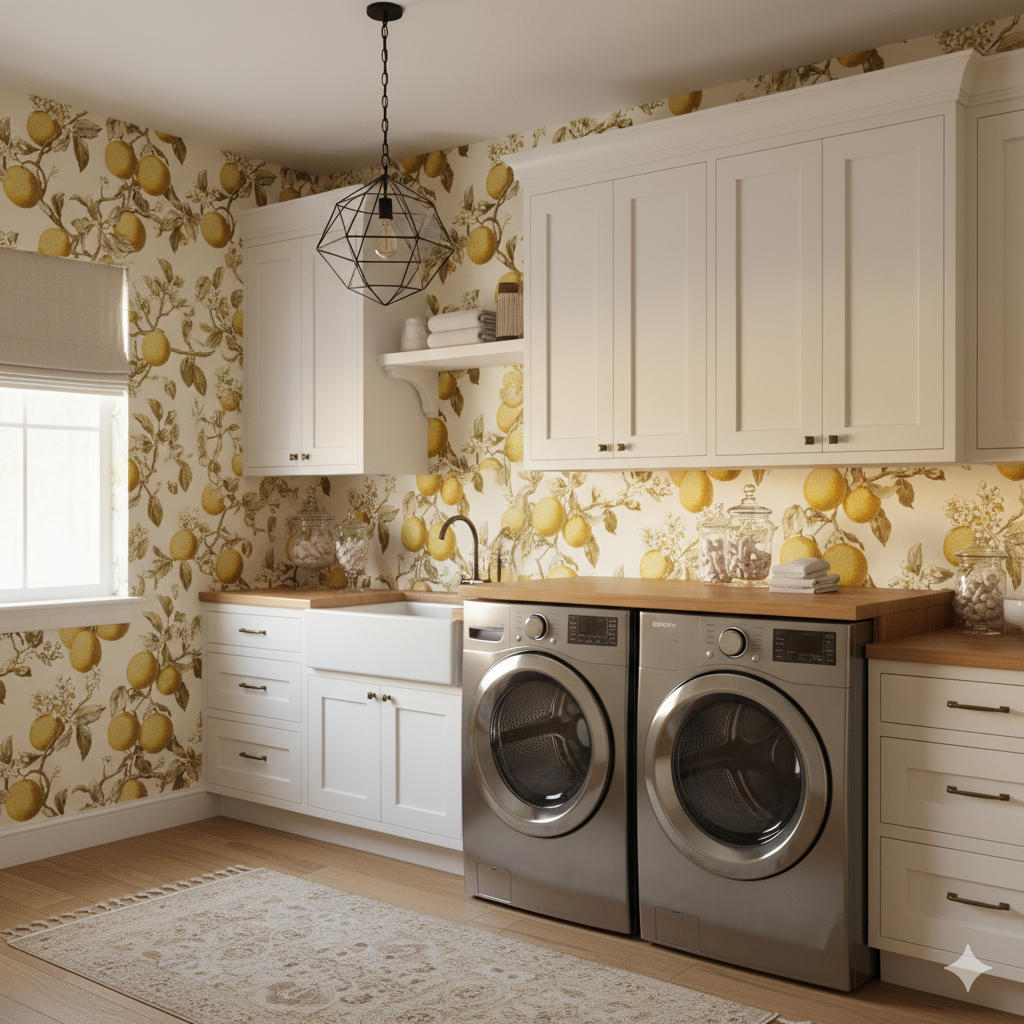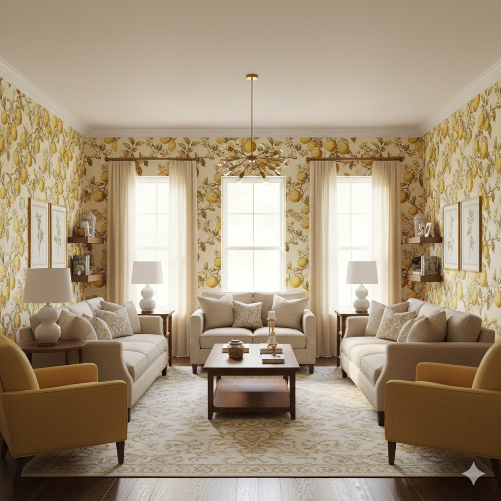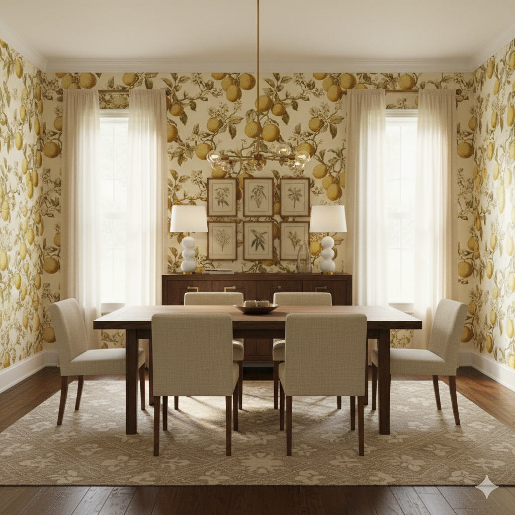 Evoking the charm of antique botanical prints, "Citrus Script" features golden oranges delicately illustrated alongside blooming citrus blossoms. The pattern’s precise ink detailing and sun-washed palette of ochre, ivory, and sepia make it ideal for kitchens, breakfast nooks, or sunrooms seeking a rustic yet refined Mediterranean touch. Bright, fresh, and historically elegant.