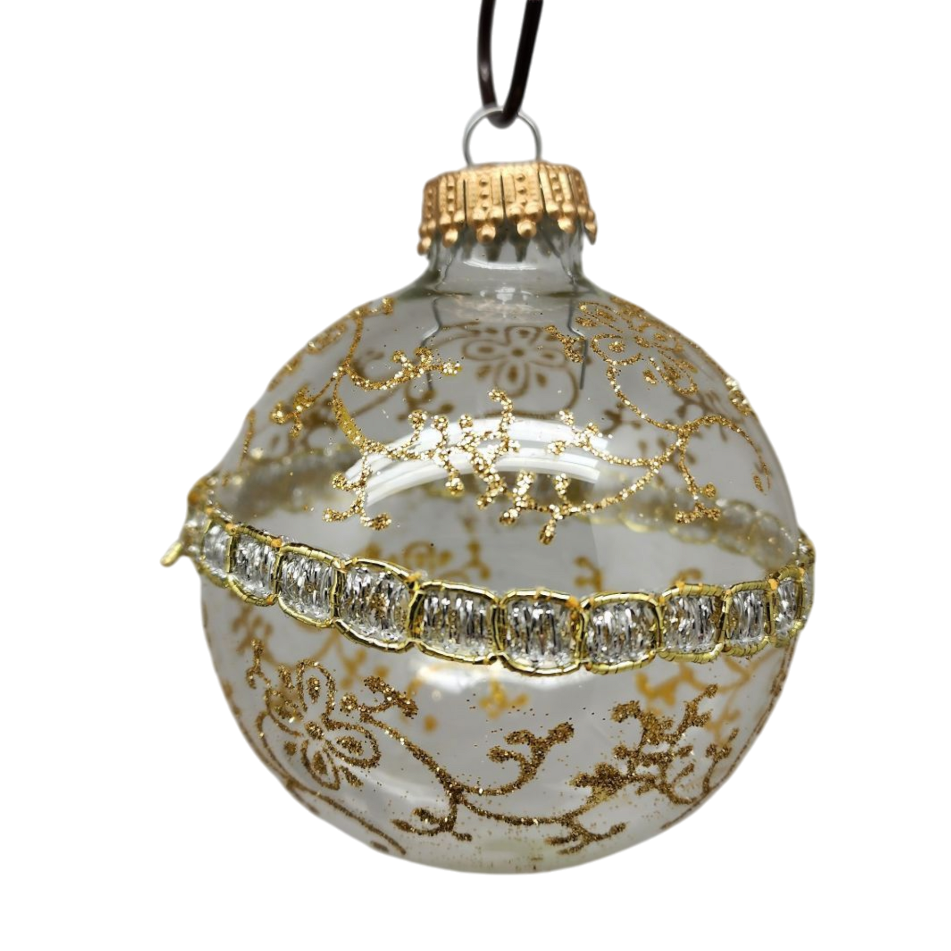 - Set includes 4 beautiful ornaments, each with intricate gold detailing; Includes 2 Clear and 2 Frosted
