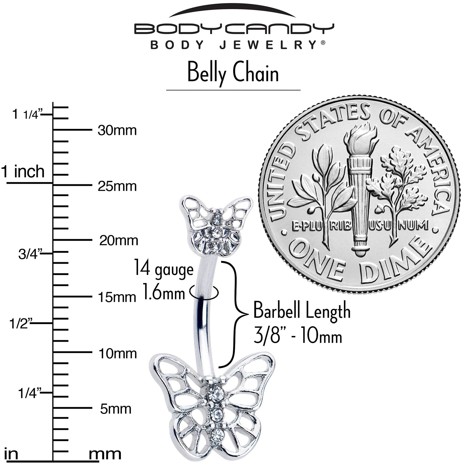 Don't let your midriff go bare when you wear your favorite halter top or belly shirt. This sexy belly chain jewelry is attached to a 14 gauge navel ring made with a 7/16 inch 316L surgical grade stainless steel curved barbell. The top end features a butterfly's head with openwork detail and clear cubic zirconia gems. The bottom end features the butterfly's wings, in matching open style and set with more clear cubic zirconia gems. The chain portion is set all along its length with white faux pearls for stunning style. This belly piercing jewelry features a 28.5 inch length waist belt. The waist chain features a lobster clasp used to adjust the length to fit your body.Specifications