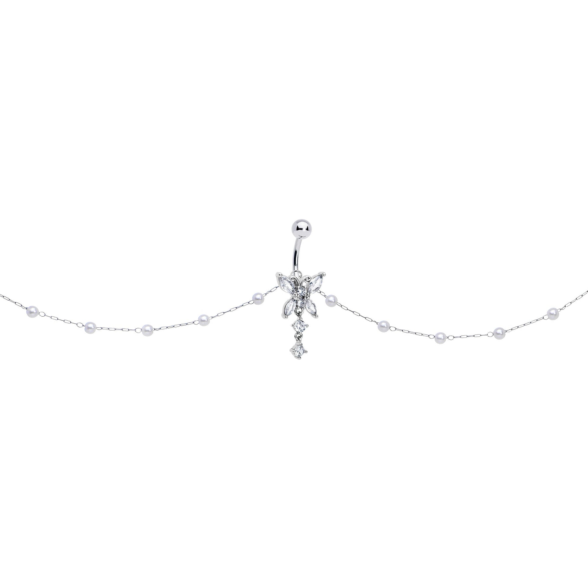 Clear CZ Gem Glam Butterfly Faux Pearl Dangle Belly Ring Belly Chain