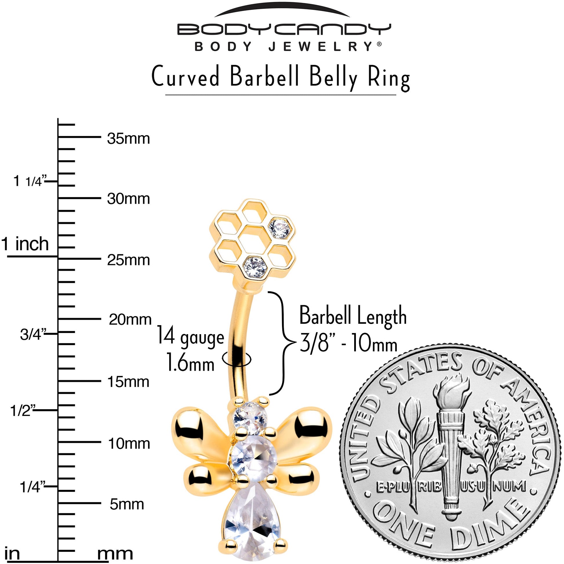 You'll bee the hottest bee in the hive with this 14 gauge navel ring. It's made with a 3/8 inch gold tone PVD over 316L surgical grade stainless steel curved barbell. The top end features a honeycomb charm, set with clear cubic zirconia gems. The bottom end features a bee charm with the body composed entirely of clear cubic zirconia gems and contrasting wings. Whether you're a worker, a drone, or the queen, you'll be the sweetest looking honey in the room with this elegant bee and honeycomb belly piercing jewelry.Specifications