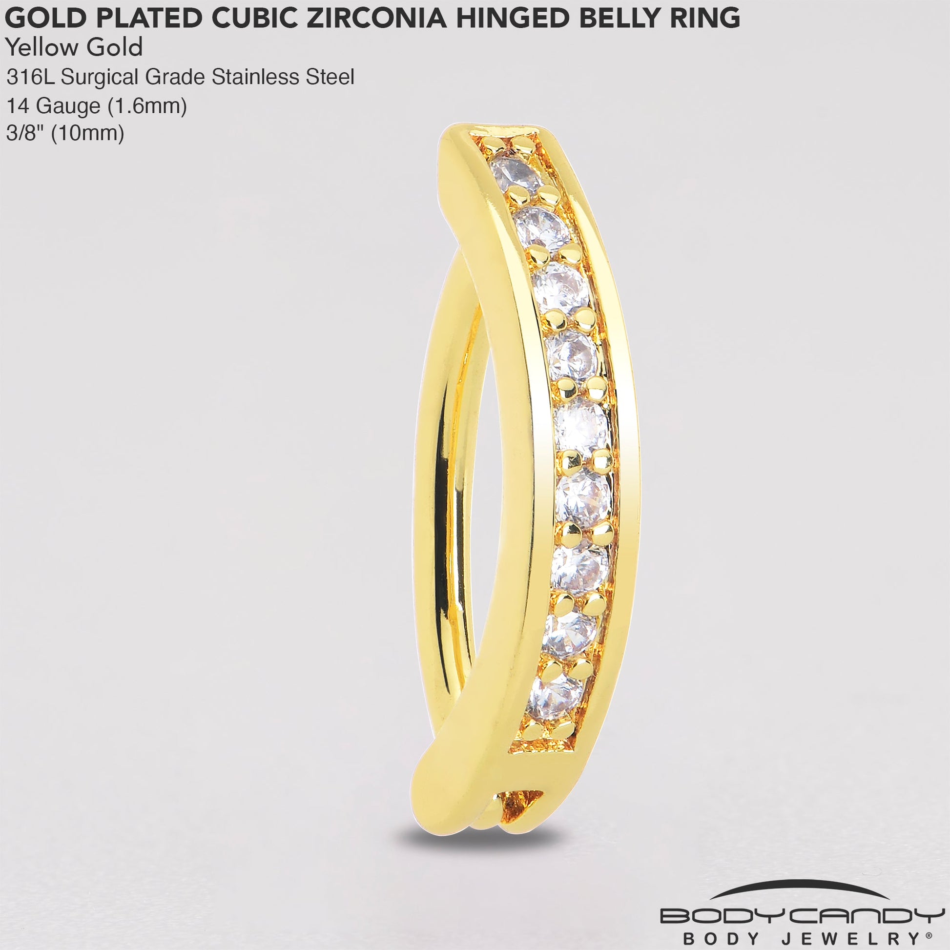 Get fashion forward with this 14 gauge navel ring. It is made with a 3/8 inch gold tone PVD over 316L surgical grade stainless steel hinged circular ring. It features a forward facing row paved with clear cubic zirconia gems for a classic look of sumptuous style. It also features a non-removable, hinged segment that makes insertion and removal a breeze. You can face the day looking gorgeous with this elegant belly piercing jewelry.Specifications