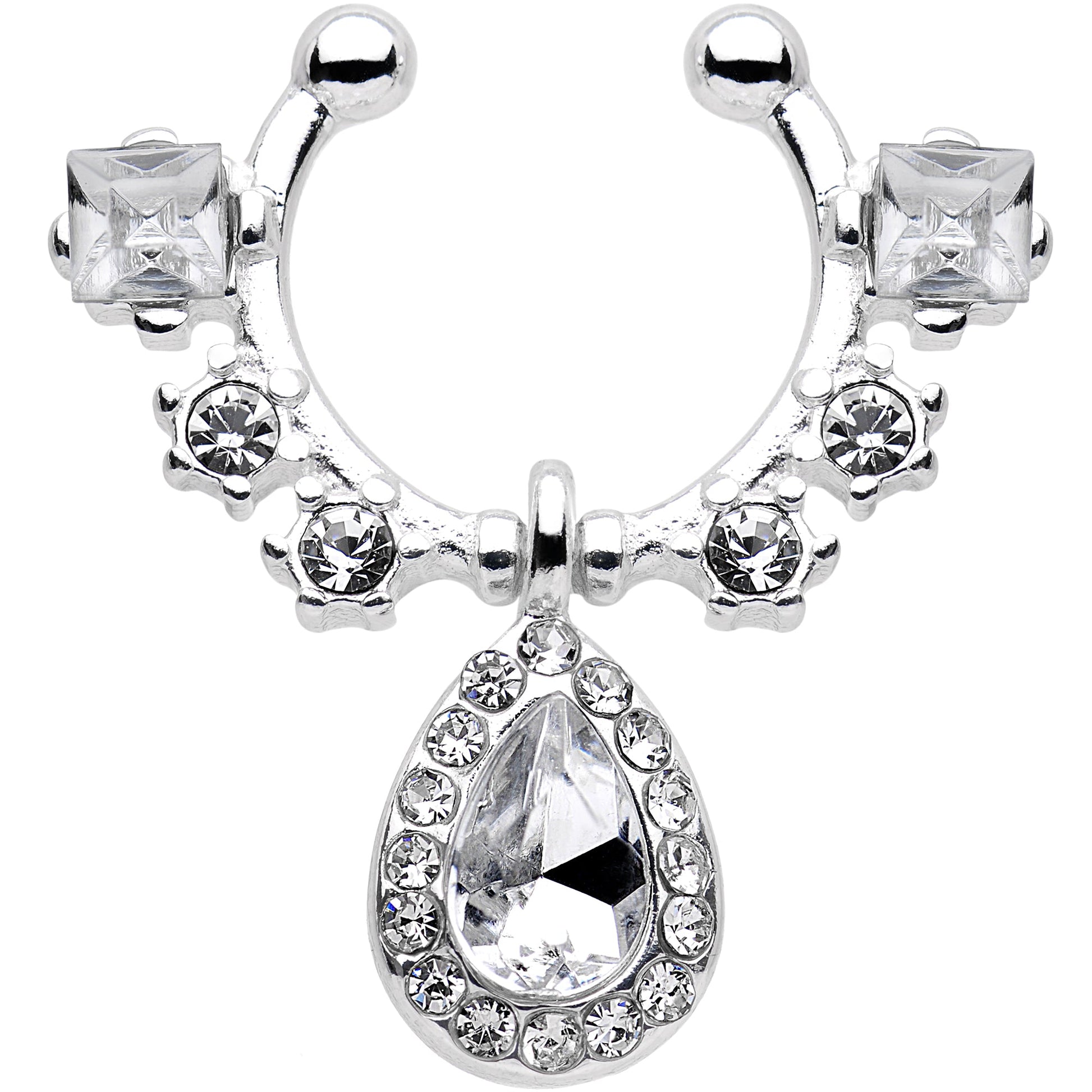 Embrace one of the hottest trends around and replicate the look of a pierced septum without the commitment. This non-pierced clip on septum hanger features a gem encrusted design, accented with a dangling clear gem charm. Made with 316L surgical grade stainless steel, this piece is bendable for easy insertion.