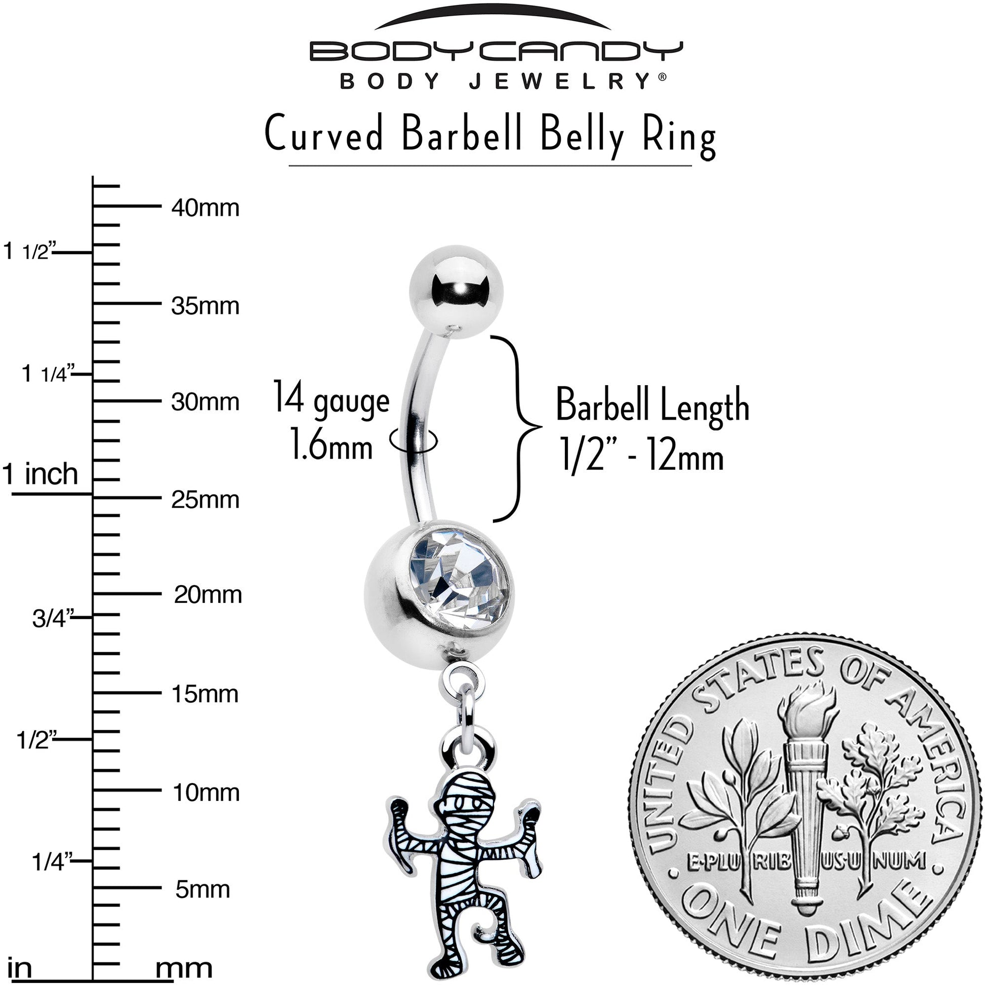 The mummy on this 14 gauge navel ring will definitely give you a Halloween thrill. It's made with a 3/8 inch 316L surgical grade stainless steel curved barbell with a 5mm top ball end. The bottom ball end is 8mm and set with a large clear gem. Dangling beneath it is a mummy charm white wrappings and black detailing, arms spread as though it's ready to grab someone and one leg lifted as if caught in mid-stride. With graphic styling and creepy detail, the mummy on this belly piercing jewelry will have your piercing looking petrifying.Specifications