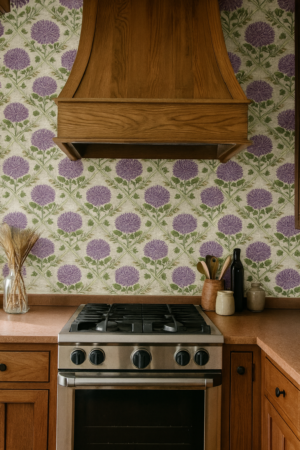 “Clover Carousel” spins a romantic nod to heritage charm with detailed depictions of purple prairie clovers arranged in a structured diamond grid. The plum-colored florals are accented with lush green stems and leafy textures, set against a cream backdrop with delicate latticework. Perfect for traditional dining rooms, cottage kitchens, or vintage-inspired guest rooms, this design delivers timeless elegance with a prairie twist.