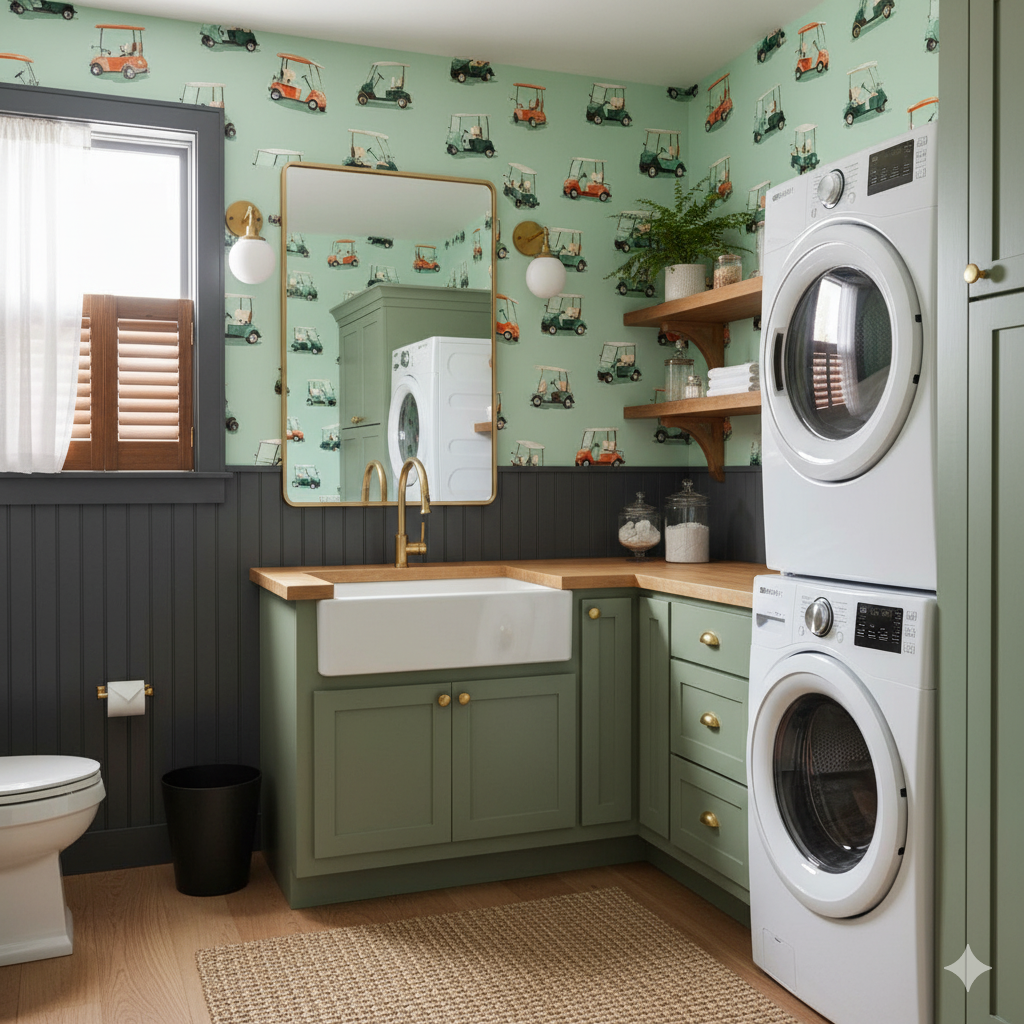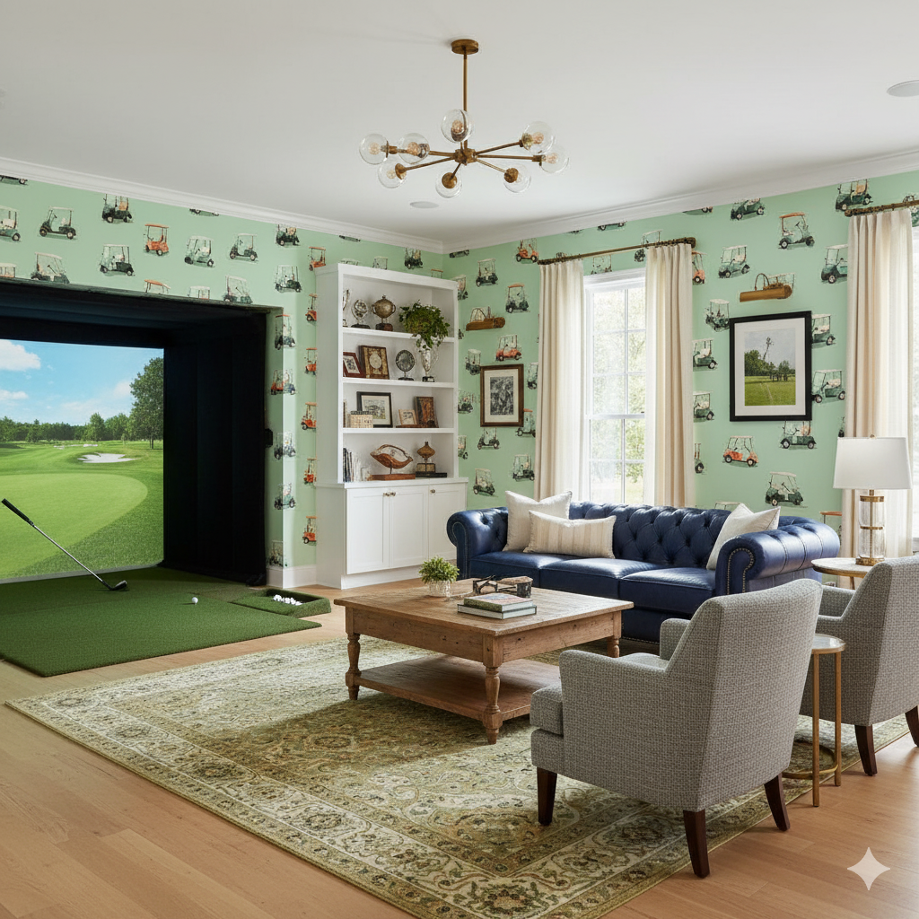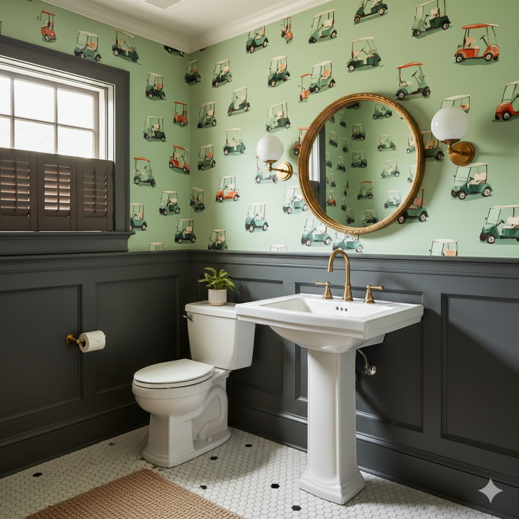 Whimsical yet chic, this wallpaper scatters colorful golf carts across a soft green ground. Rendered in shades of orange, teal, and cream with painterly brushwork, the carts feel playful but not cartoonish—more boutique illustration than novelty print. Clubhouse Run is perfect for recreational spaces, vacation rentals, or themed hospitality projects, infusing interiors with a wink of leisure and nostalgia. It’s an ideal pick for game rooms, pool houses, or even a bar area where personality is key. While undeniably playful, the painterly style gives it sophistication, making it work in both casual family spaces and more curated, design-forward projects that want to surprise and delight.