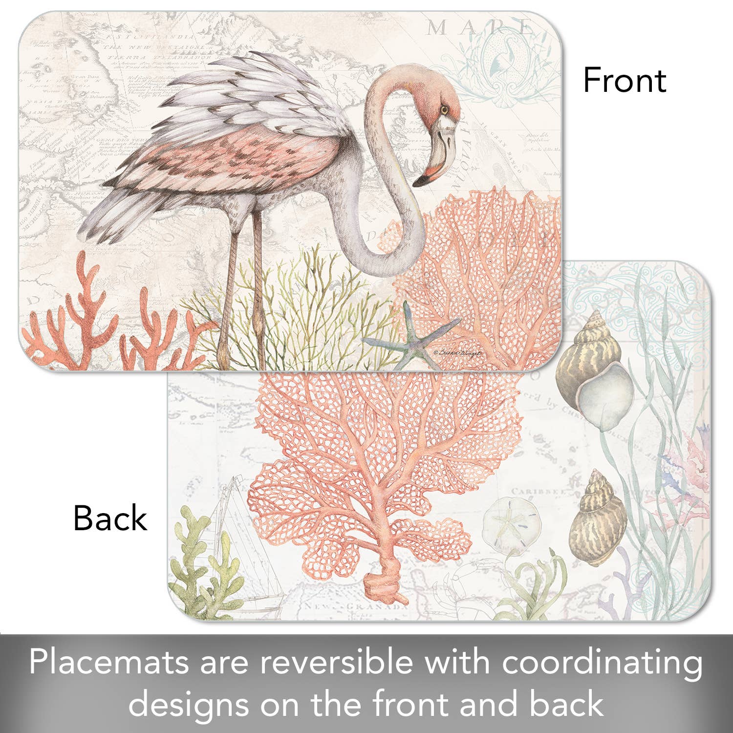 Double-sided coastal design: flamingo & coral on one side, seashells & coral reef on the other