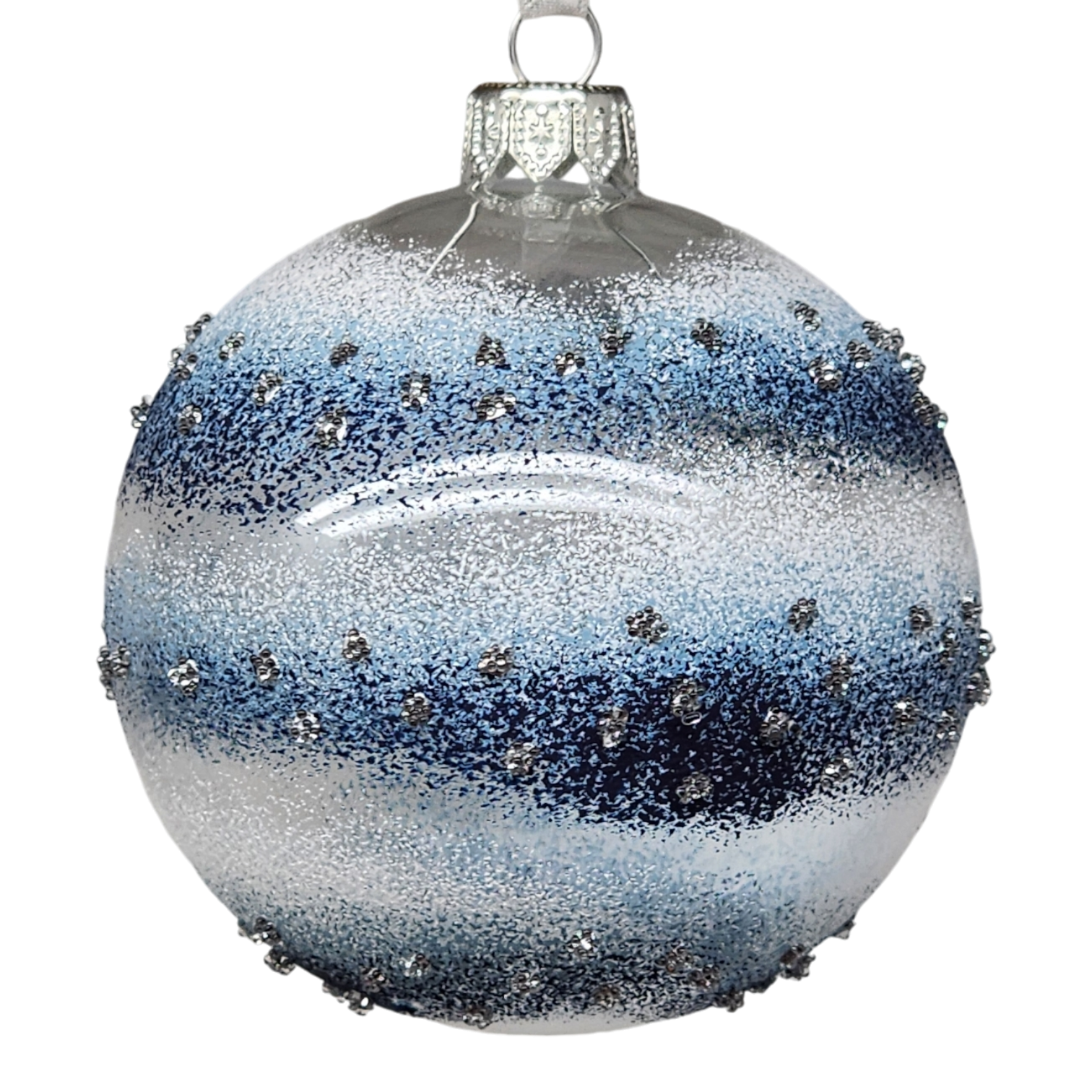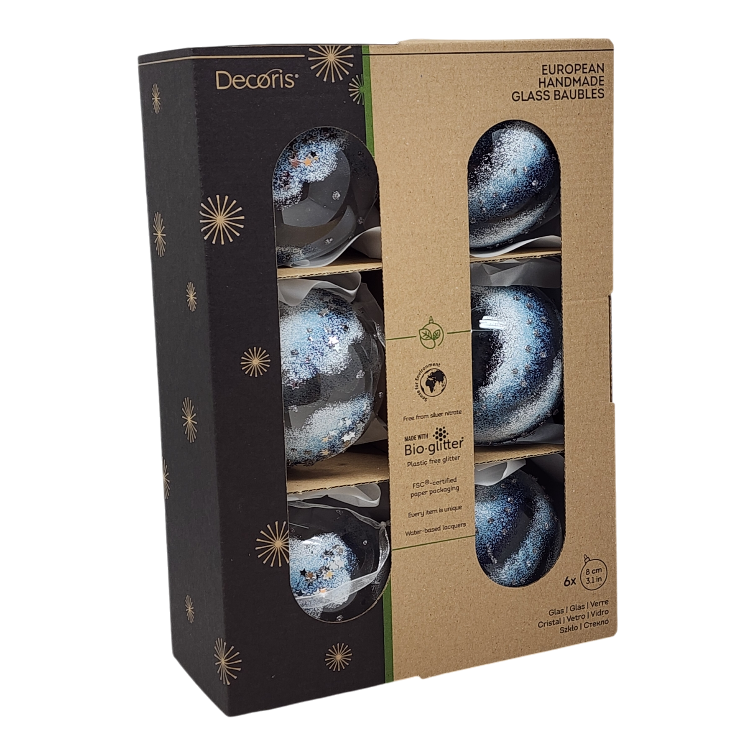 Brighten up your holiday decor with the enchanting Decoris Handmade Glass Baubles set, inspired by the beauty of a wintry night sky. This exquisite collection includes six striking ornaments, each measuring approximately 3.1 inches in diameter. The baubles feature a captivating mix of deep blues, sparkling silvers, and shimmering whites, adorned with a cosmic design of stars and glitter that evokes a sense of magic.