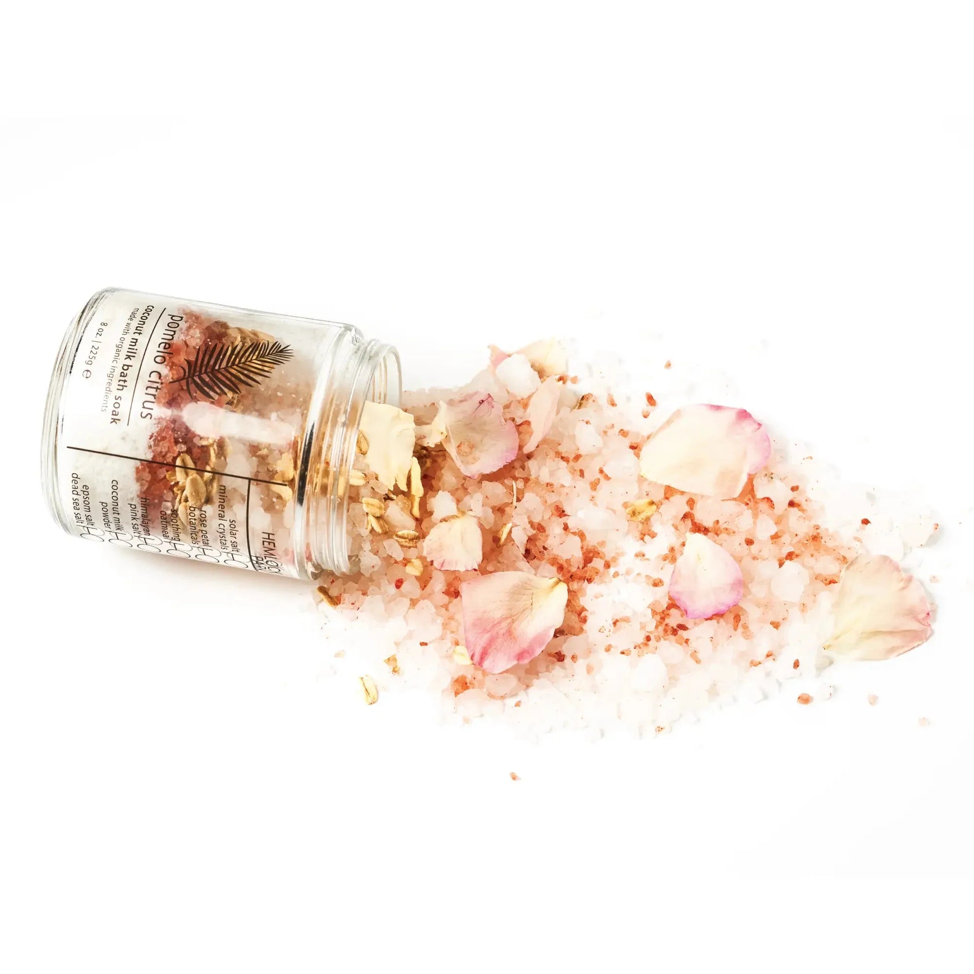 Pure & simple vegan ingredients made with organic ingredients including coconut milk powder, dead sea mineral salt, Epsom salt, Himalayan pink salt, California mineral solar sea salt, organic pressed oats, and botanicals.