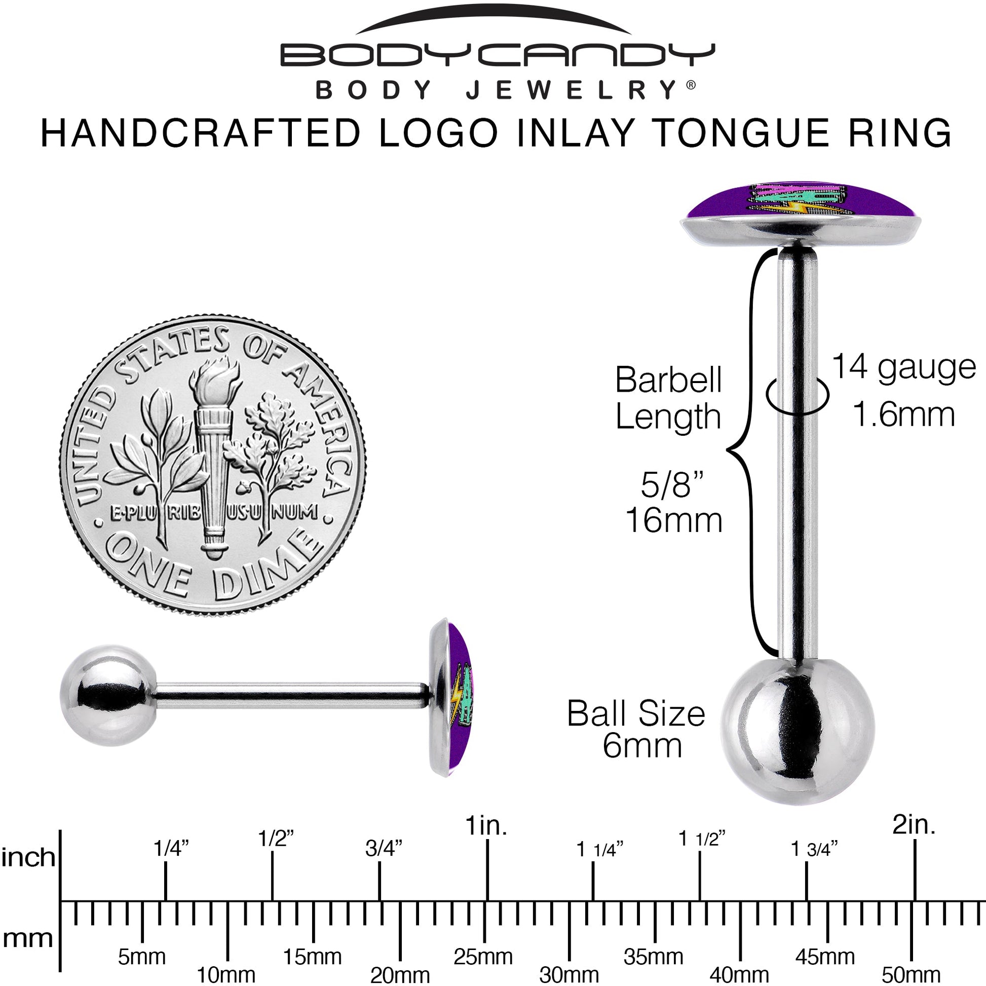 Get ready to kill em with style when you're rocking this 14 gauge tongue barbell. It's made with a 5/8 inch 316L surgical grade stainless steel straight barbell with a 6mm bottom ball end. The top end features a purple logo disc charm with the word Slay on it. The letters are red, green, and purple and the L is composed of a yellow lightning bolt, giving the overall look of seriously colorful rocker style. Get a look that will slay for sure with this sassy tongue piercing jewelry.