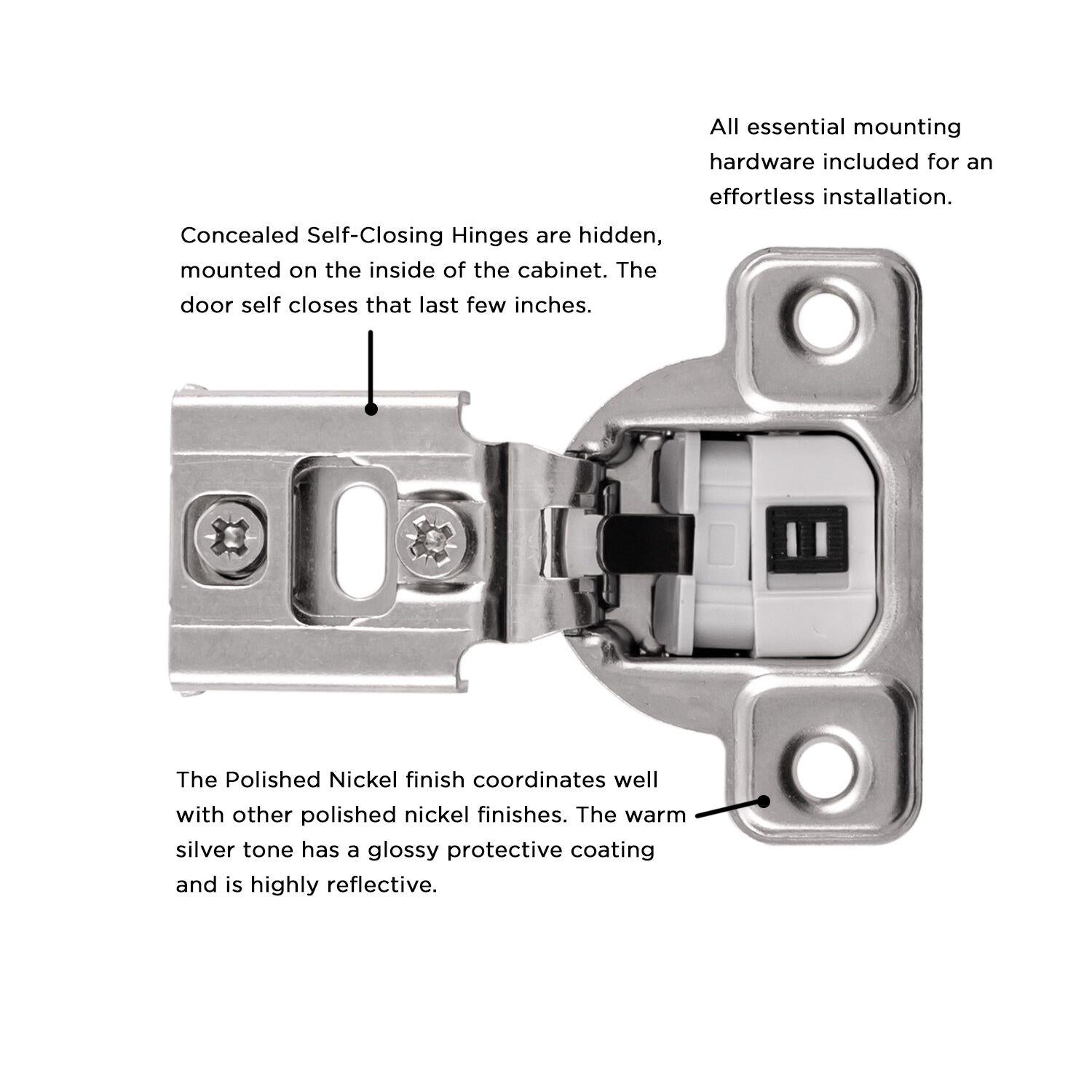 The Polished Nickel finish coordinates well with other polished nickel finishes. The warm silver tone has a glossy protective coating and is highly reflective.