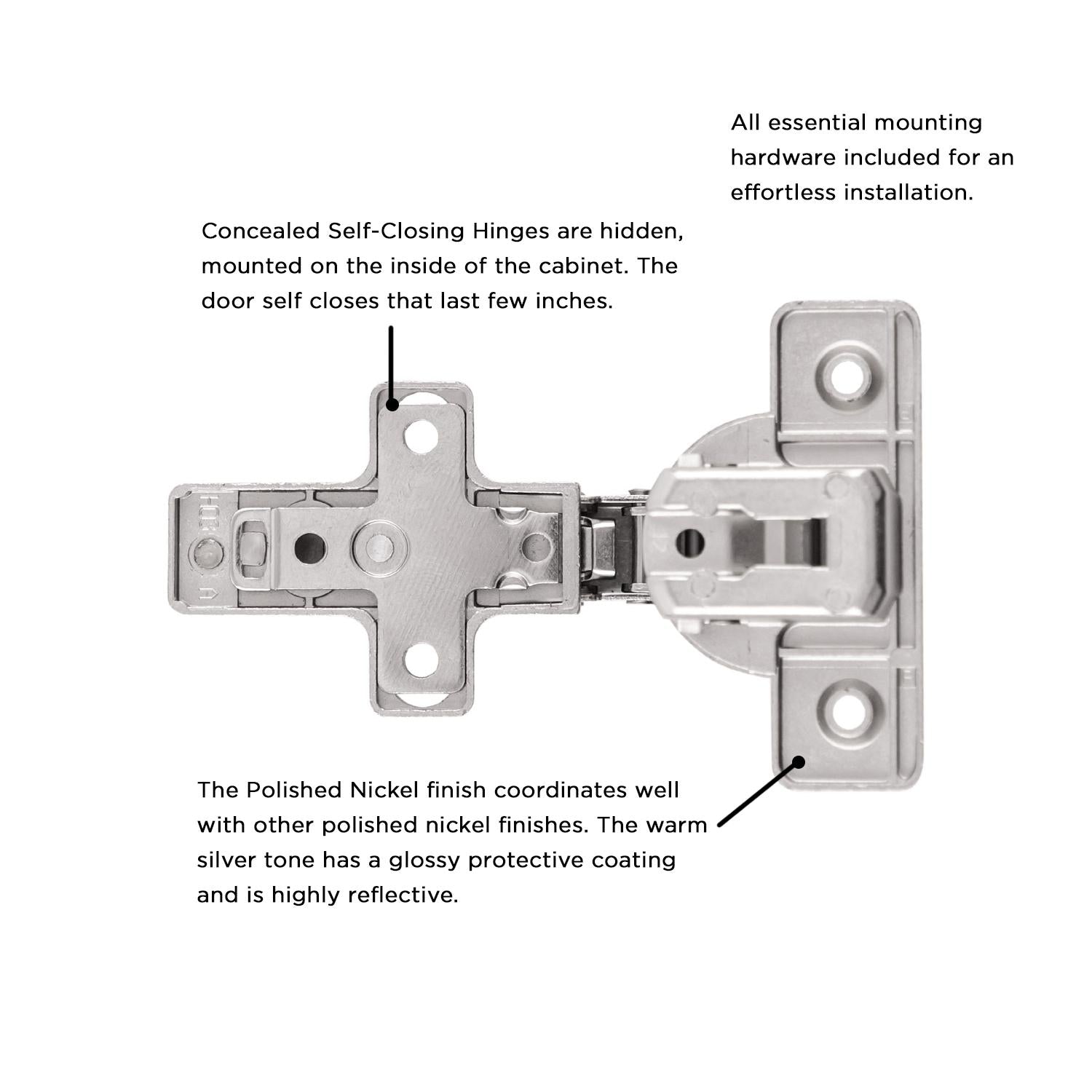 The Polished Nickel finish coordinates well with other polished nickel finishes. The warm silver tone has a glossy protective coating and is highly reflective.
