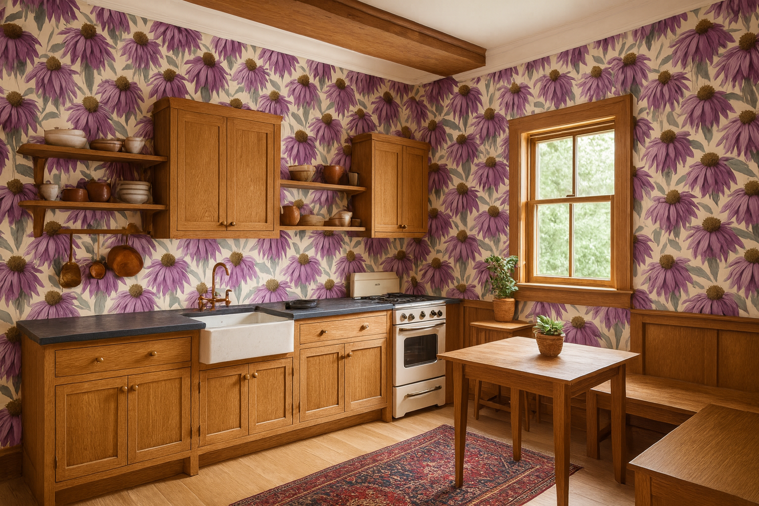 “Coneflower Waltz” is a vibrant celebration of the beloved purple coneflower (Echinacea). Illustrated with soft painterly strokes, the oversized blooms sway gracefully across a warm cream background. The lush greens and purples strike a perfect balance between lively and calming. Ideal for wellness spaces, feminine bedrooms, or modern farmhouse interiors, this wallpaper brings nature’s healing presence to your décor.