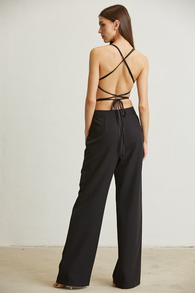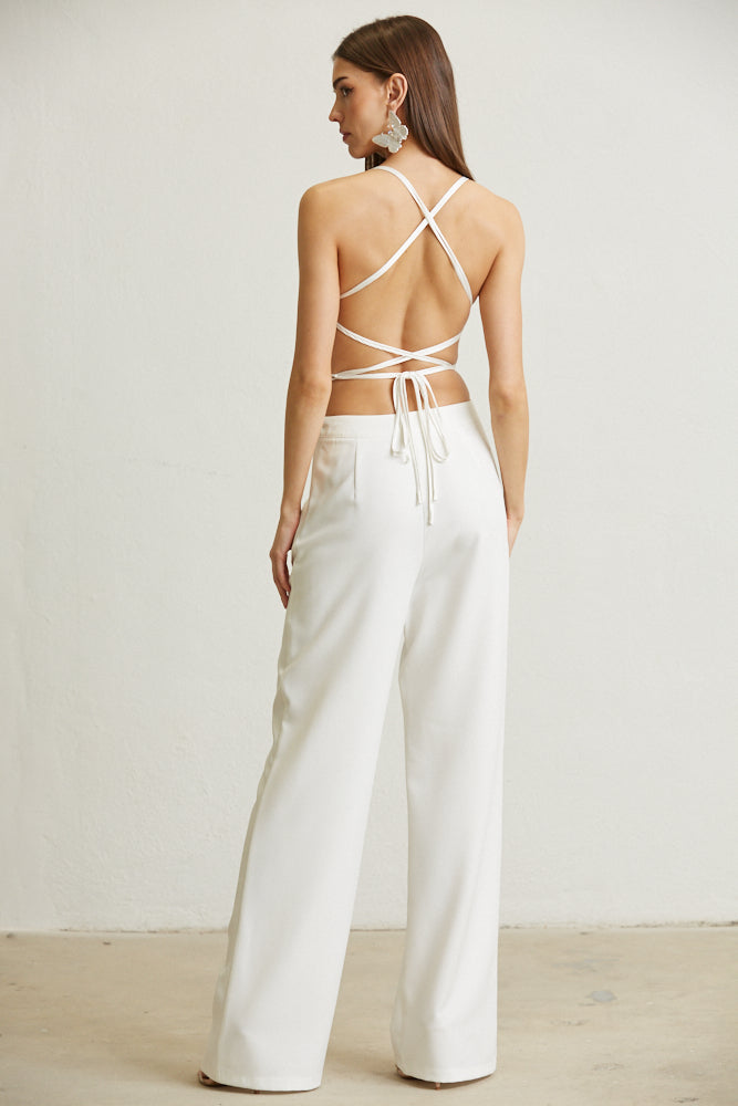 SET- TOP AND PANT SET- MESH PATTERN TOP AND SOLID WOVEN PANTS- BUTTERFLY SHAPE CROP TOP- FLIMSY WITH A LACE UP BACK- HIGH WAIST, WIDE LEG PANT FIT- INVISIBLE SIDE ZIPPER- 100% POLYESTER