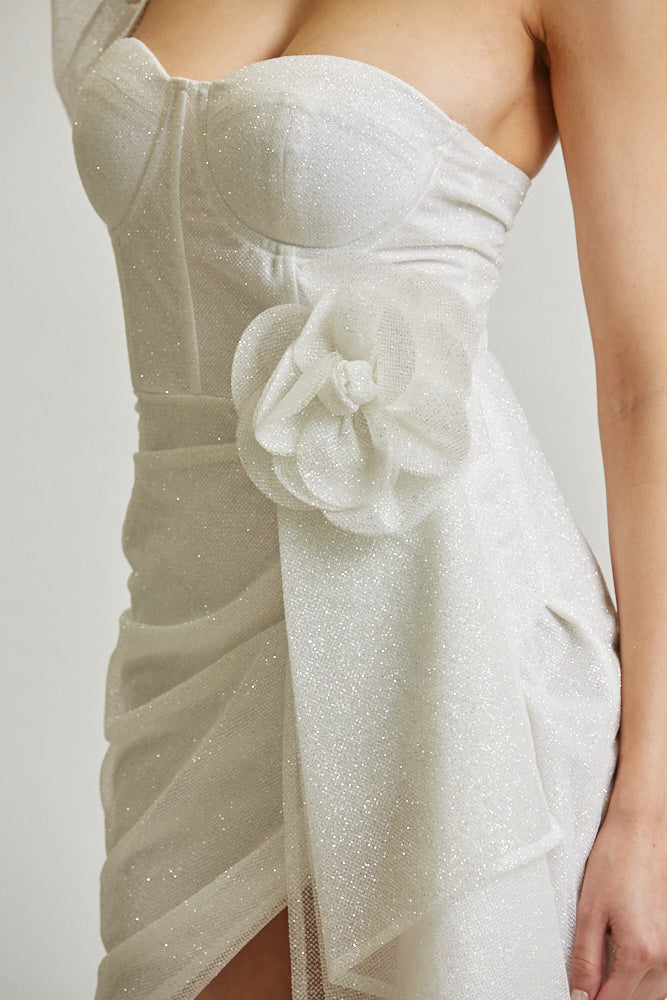 - DRAPED DETAILING WITH 3D FLOWER TRIM