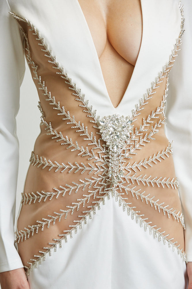 DRESS- SOLID WOVEN FABRIC- PLUNGING NECKLINE- SULTRY SHEER MESH PANEL FRONT- OPULENT RHINESTONE DESIGN + CENTER BROOCH- INVISIBLE ZIPPER BACK- 60% RAYON 35% NYLON 5% SPANDEX