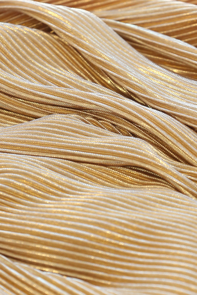 - GOLD METALLIC PLISSE FABRIC- ADJUSTABLE ONE-SHOULDER CHAIN STRAP- CUTOUT FRONT + WAIST- GOLD CHAIN TUNNELLED WAIST TRIM- LONG, MAXI DRESS LENGTH- ZIPPER BACK CLOSURE- 100% POLYESTER SIZE AND FIT- MODEL WEARS A SMALL- MODEL: 5'8