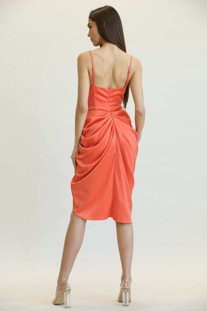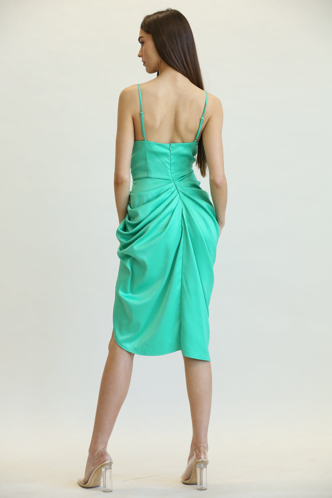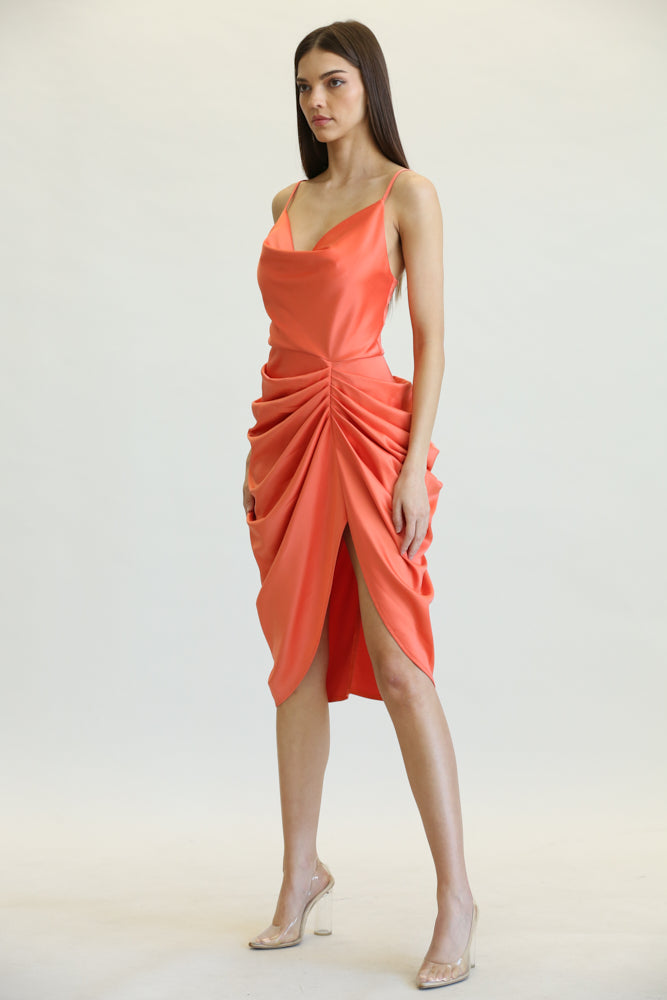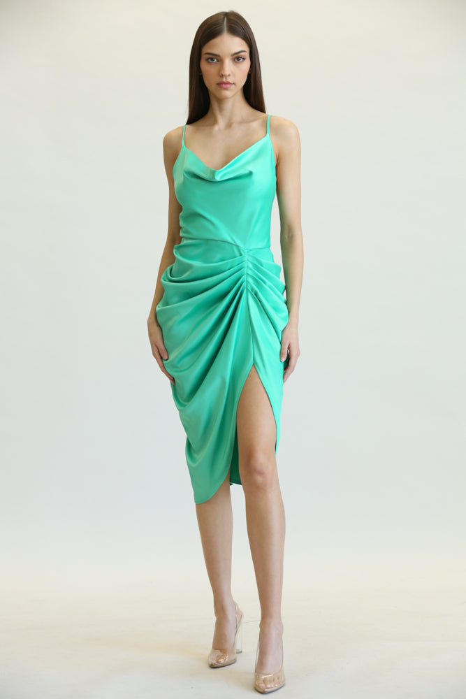- STRETCH SATIN FABRIC- COWL NECKLINE- ADJUSTABLE SHOULDER STRAPS- PLEATED DRAPED SKIRT FRONT AND BACK- FRONT LEG SLIT- ZIPPER BACK CLOSURE- 95%POLYESTER 5% SPANDEXSIZE AND FIT- MODEL WEARS A SMALL- MODEL: 5'8