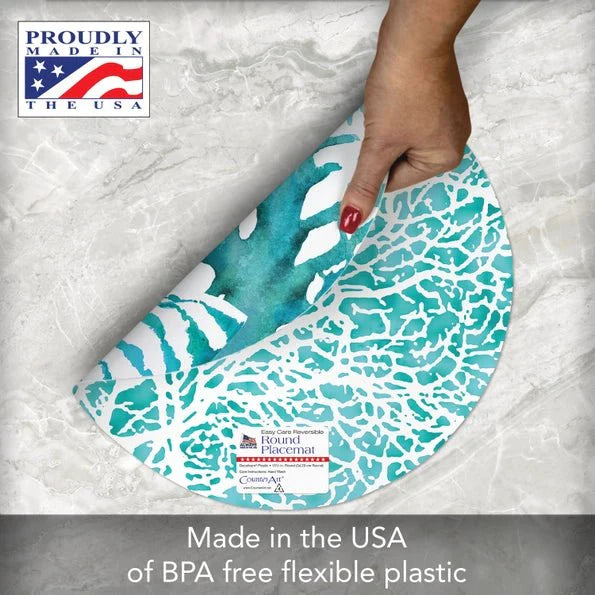 Elevate your dining experience with the Coral Life Reversible Round Plastic Placemat—an elegant blend of functionality and coastal beauty. Proudly made in the USA from BPA-free flexible plastic, this stylish placemat measures 13.5 inches round, offering the perfect size to protect your table or countertop from spills, stains, and heat damage. Its reversible design features coordinating artistic images on both sides, allowing you to switch up your table decor with ease.