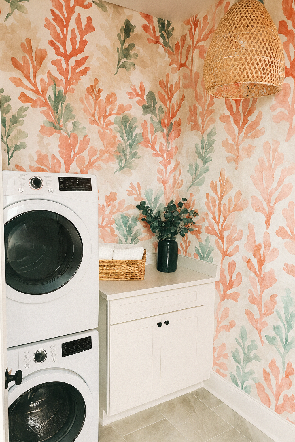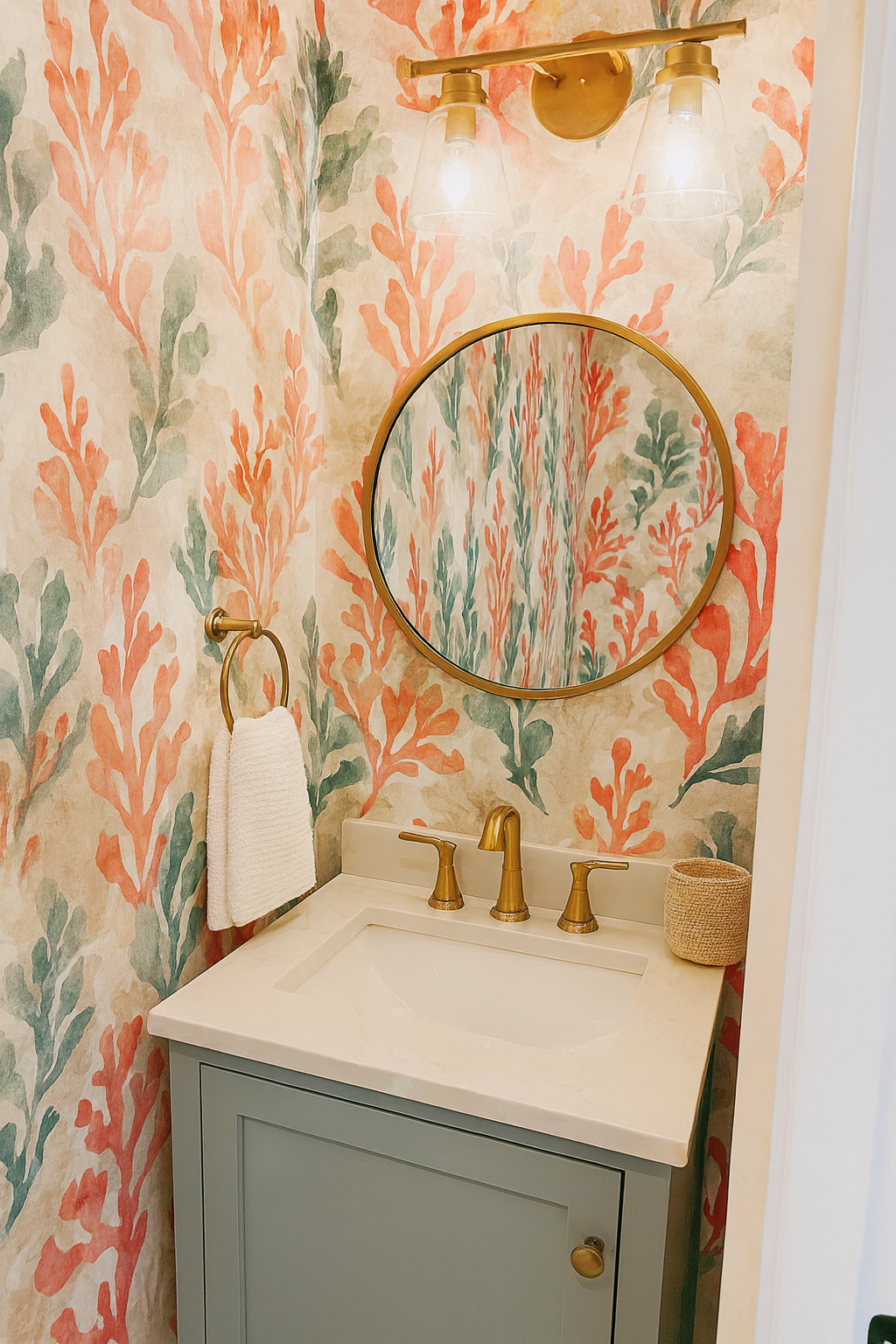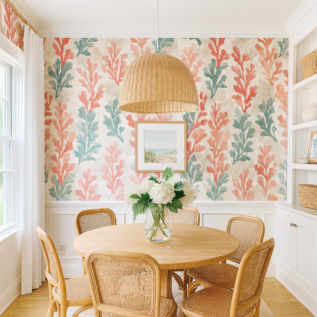 Coral Tango is an underwater dance of watercolor seaweed fronds and coral branches in shades of burnt coral, teal green, and sandy beige. With its dreamy transparency and subtle marbled texture, this coastal-inspired wallpaper evokes the serenity of the sea. Perfect for beach houses, spa bathrooms, or breezy dining spaces with a tropical-modern edge.