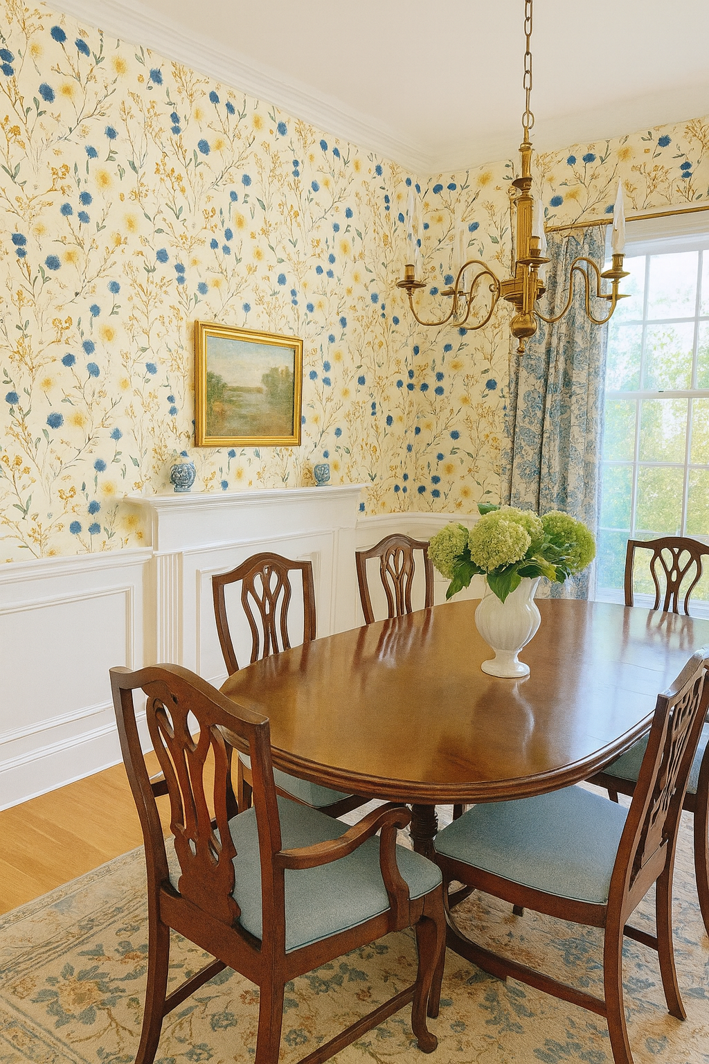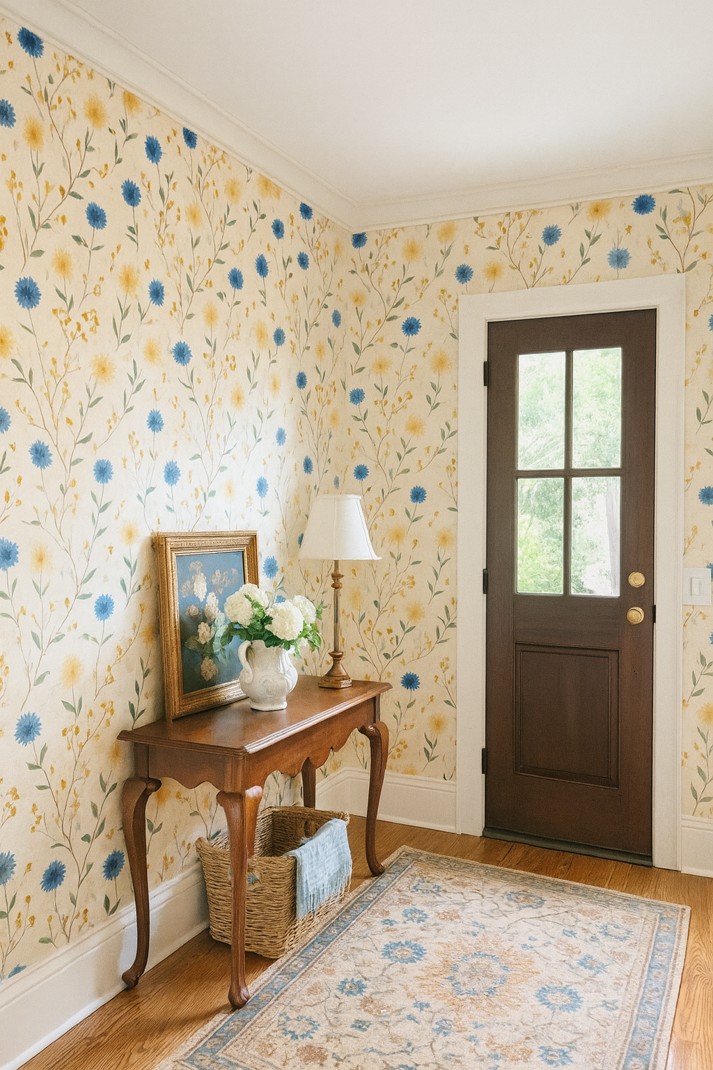 A playful dance of golden yellows and bold cornflower blues, this scattered wildflower wallpaper brings the cheer of a summer field into any space. With soft watercolor textures and fine leafy details, it strikes the perfect balance between whimsy and elegance. Ideal for kitchens, sunrooms, nurseries, or craft rooms needing a touch of nature’s charm and brightness.