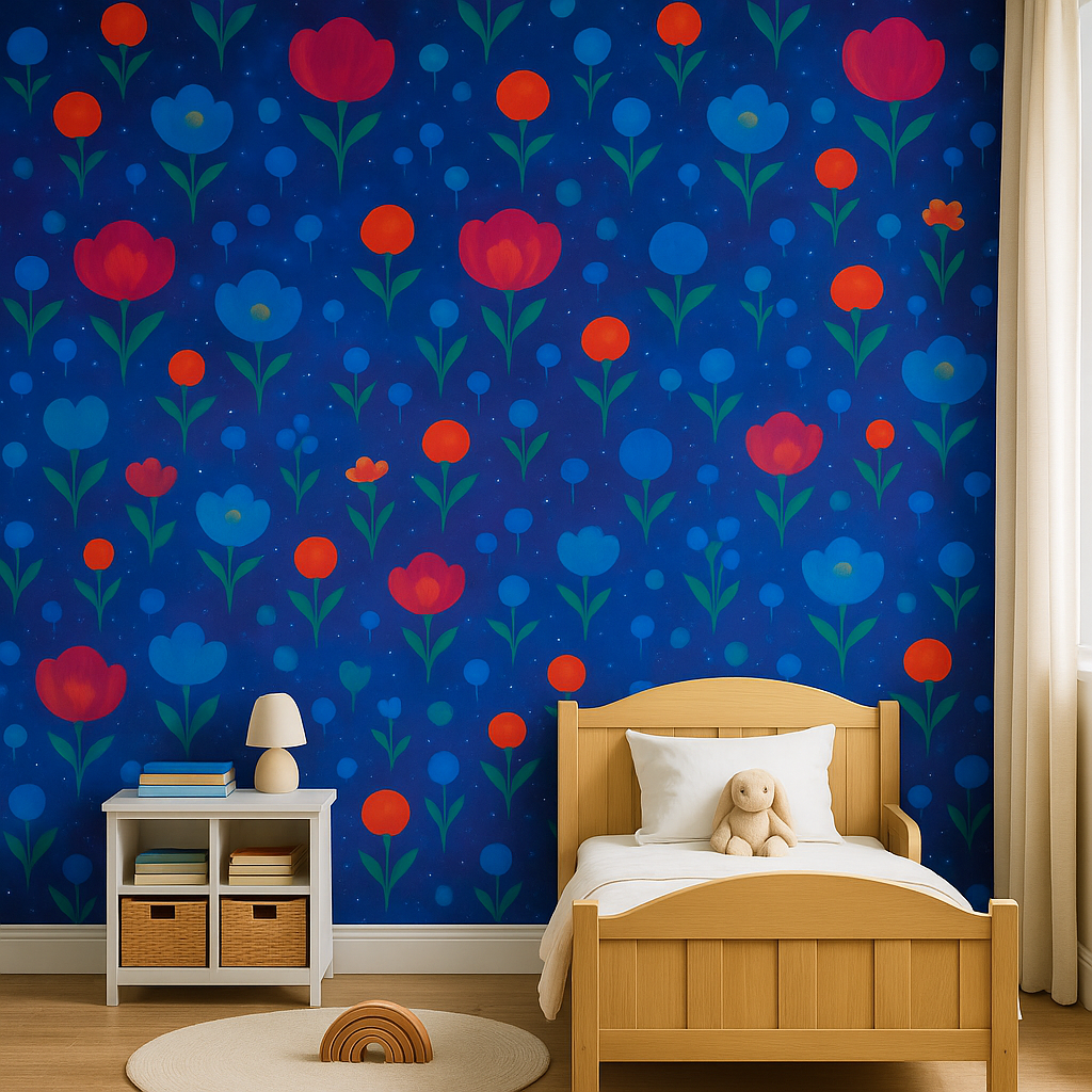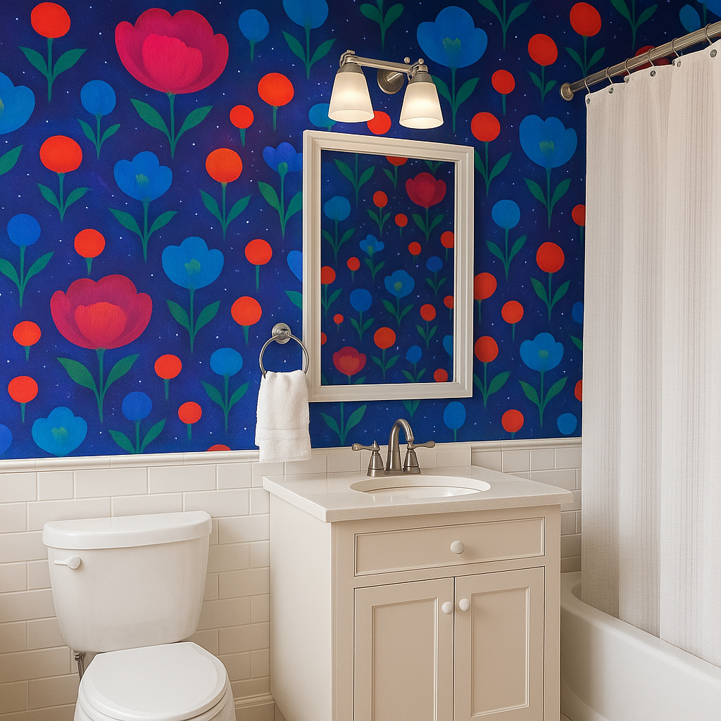 Cosmic Bloom Wallpaper is a playful, surrealist floral pattern featuring vibrant peony-like orbs in electric violet, coral, and aqua hues floating on a deep indigo night-sky backdrop. Designed for maximalist and eclectic interiors, this whimsical wallpaper is ideal for accent walls, kids’ spaces, creative studios, or anywhere you want to spark imagination. Perfect for those searching for cosmic wallpaper, whimsical floral wallpaper, modern maximalist wallpaper, or bold night sky-inspired wall coverings.
