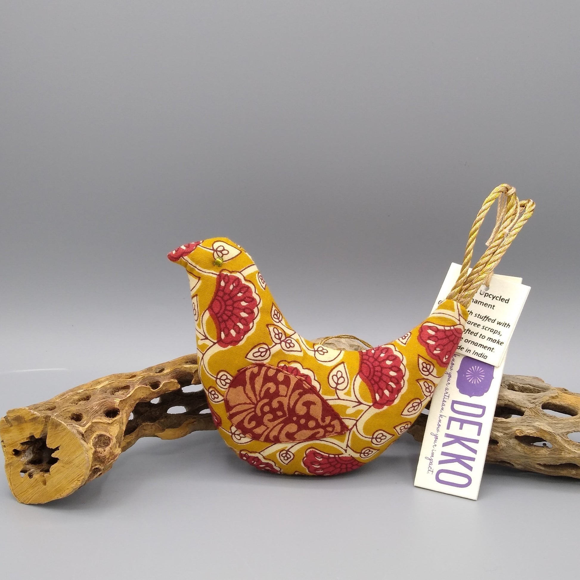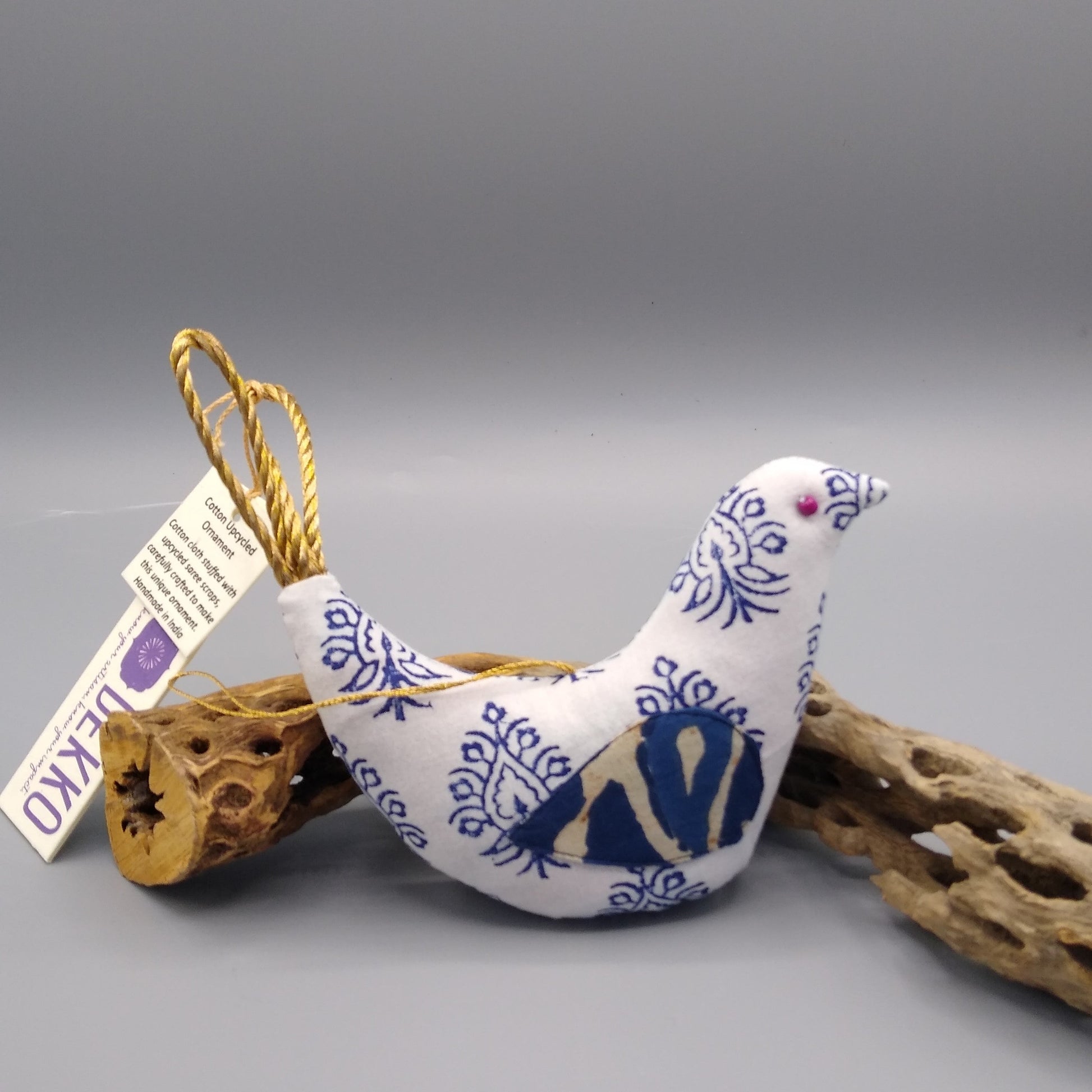 These little bird ornaments are one of our more popular holiday products, so we decided to give them a bit of a new twist. We chose bold fabric that was screen-printed by hand in Jaipur, added a wing in a complementary fabric and a glitzy foil tail. These ornaments are bright and fun, and definitely not just for the holidays!