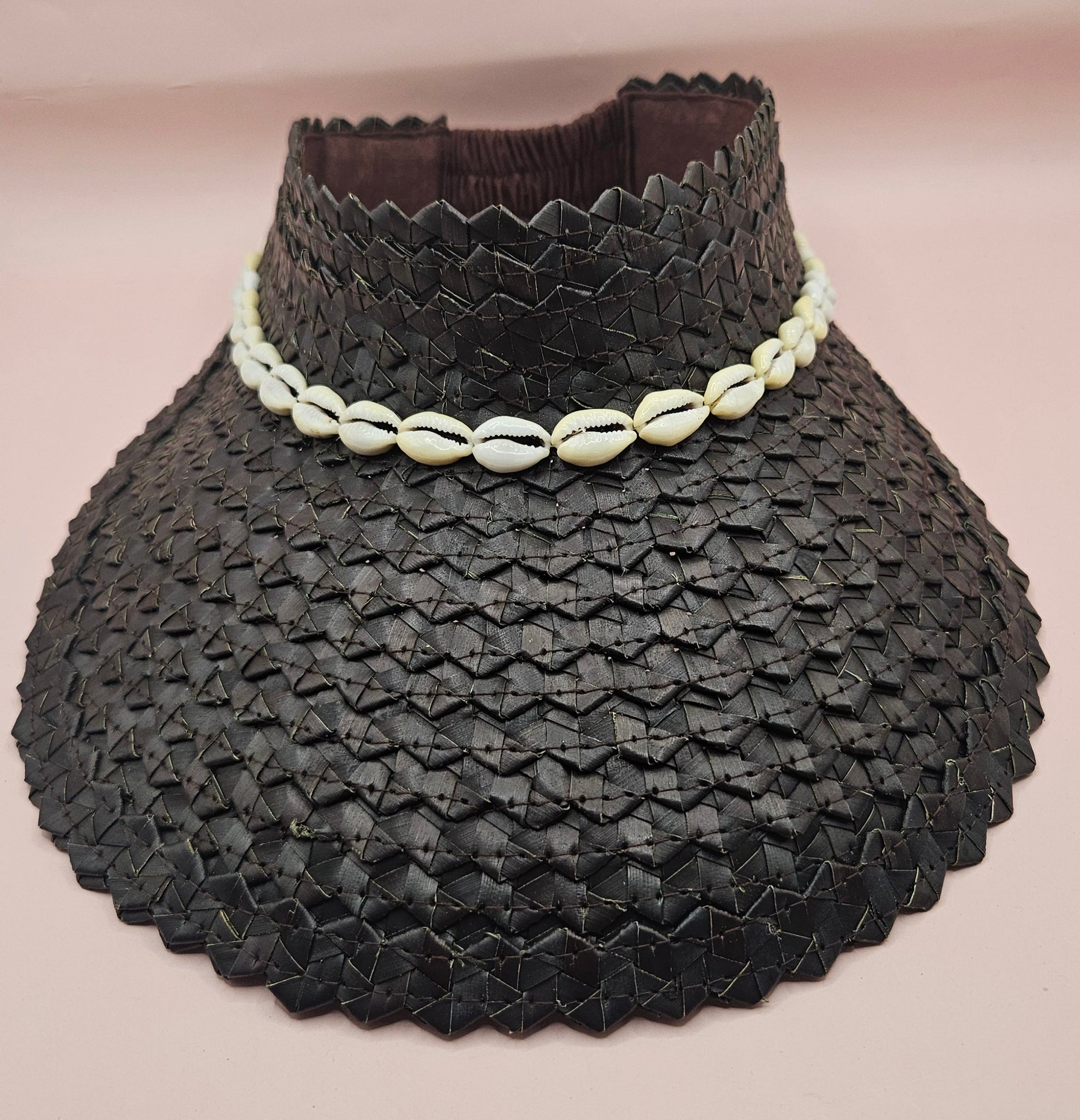 Bring island vibes to your everyday look with our cowrie shell-trimmed woven palm leaf visors. These vibrant, handmade sun visors are crafted from dyed palm straw and accented with real cowrie shells along the band. Featuring a stretch-back for a comfortable fit, they’re ideal for beach days, festivals, and sunny strolls. Available in black, turquoise blue, olive green, or mustard yellow.
