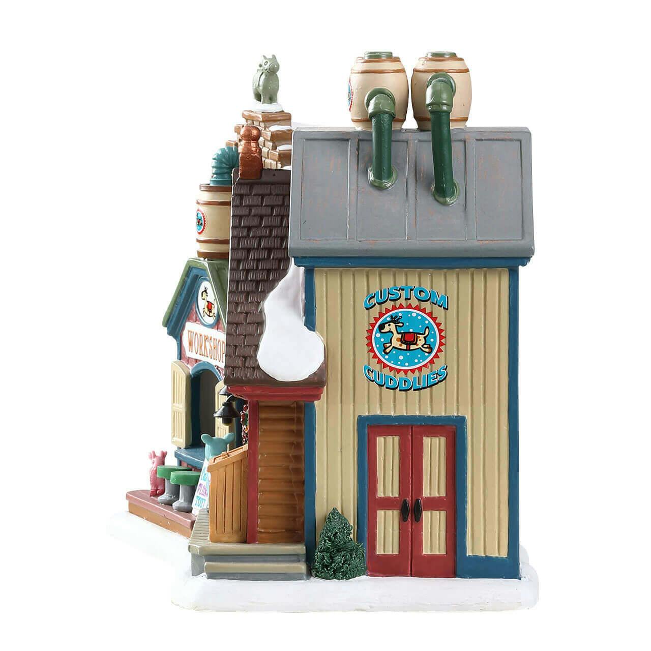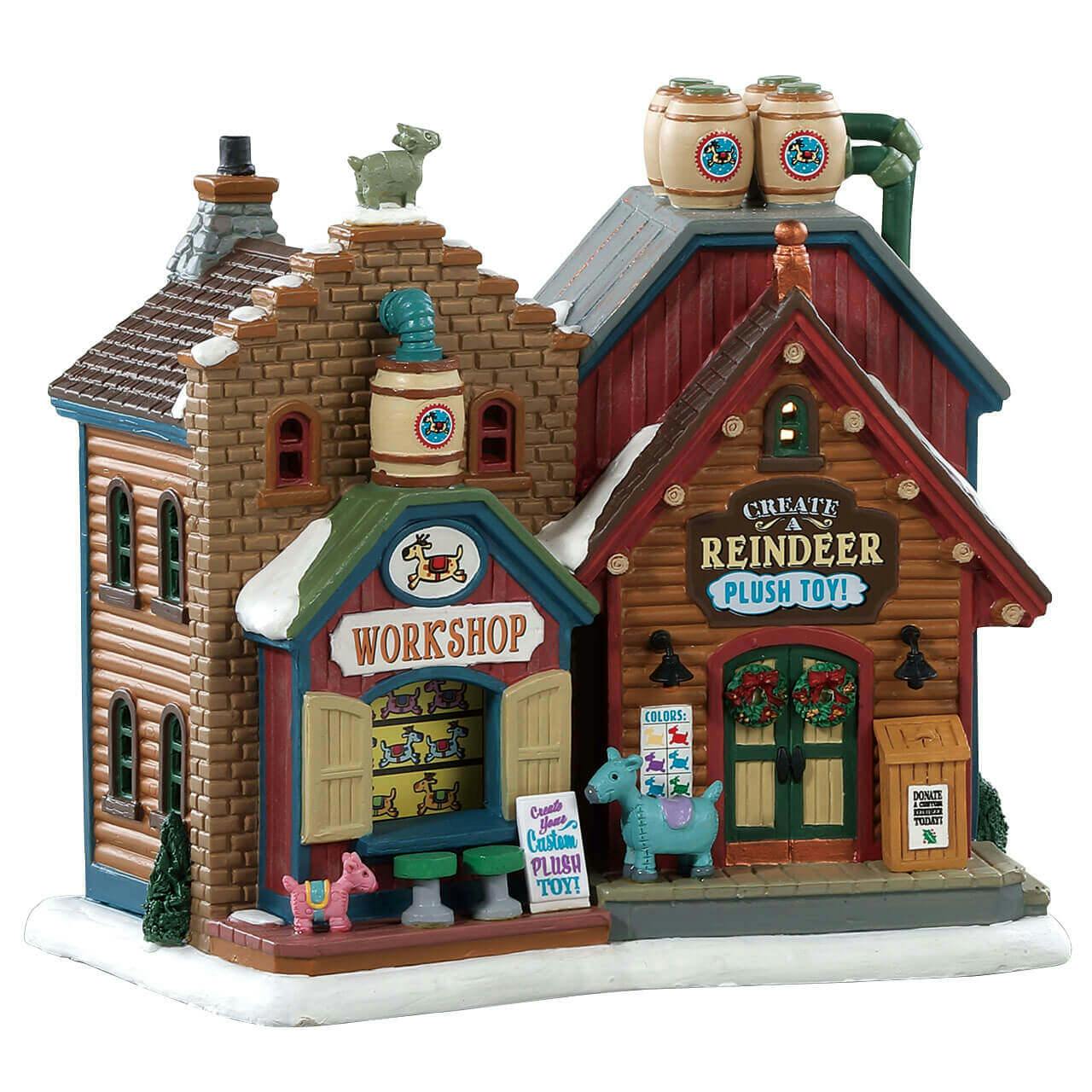 Not only is the shop a hub of creativity, but it also serves as a heartwarming reminder of the joy of giving during the holidays. The Create-a-Reindeer Plush Toy Shoppe, with its vibrant colors and intricate design, lights up beautifully with a Moonlander LED bulb. This adds a warm glow to your holiday village, creating a cozy ambiance that invites families and friends to gather around. Whether showcased as the centerpiece of your display or as a charming accent piece, this delightful shop exudes warmth, joy, and the spirit of magical holiday memories.