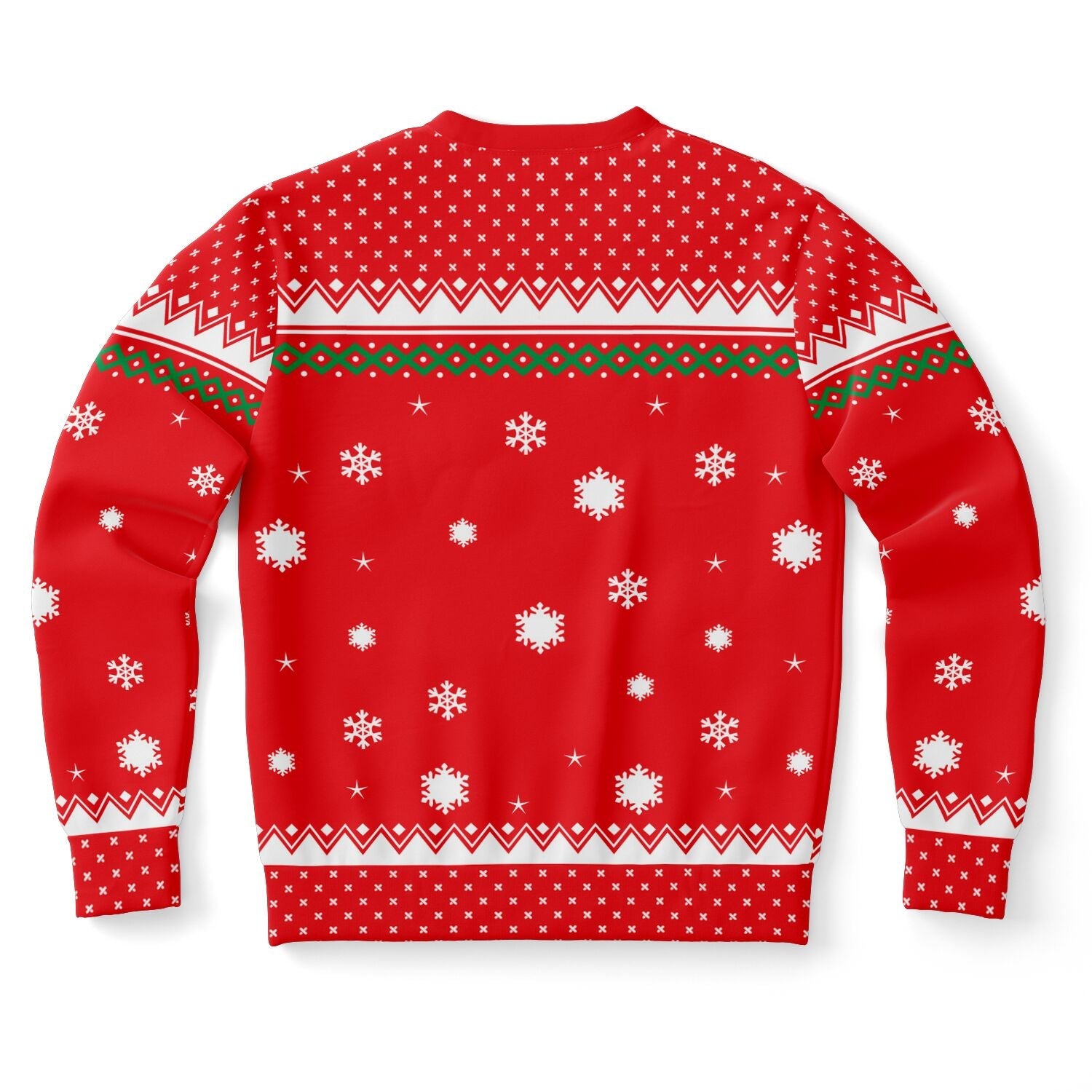 This bold red sweater features a playful message asking Santa to skip the gifts and leave the goods—perfect for maxing out holiday laughs.