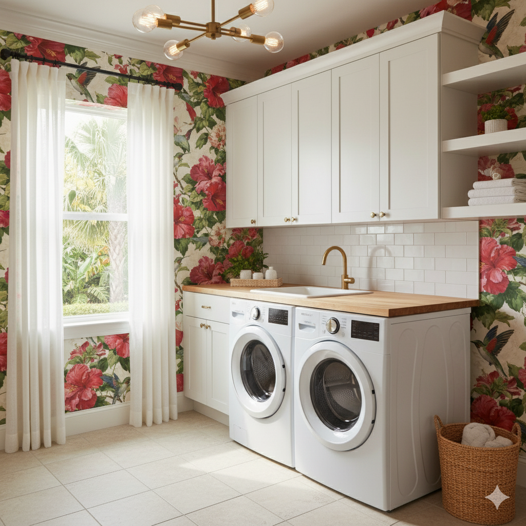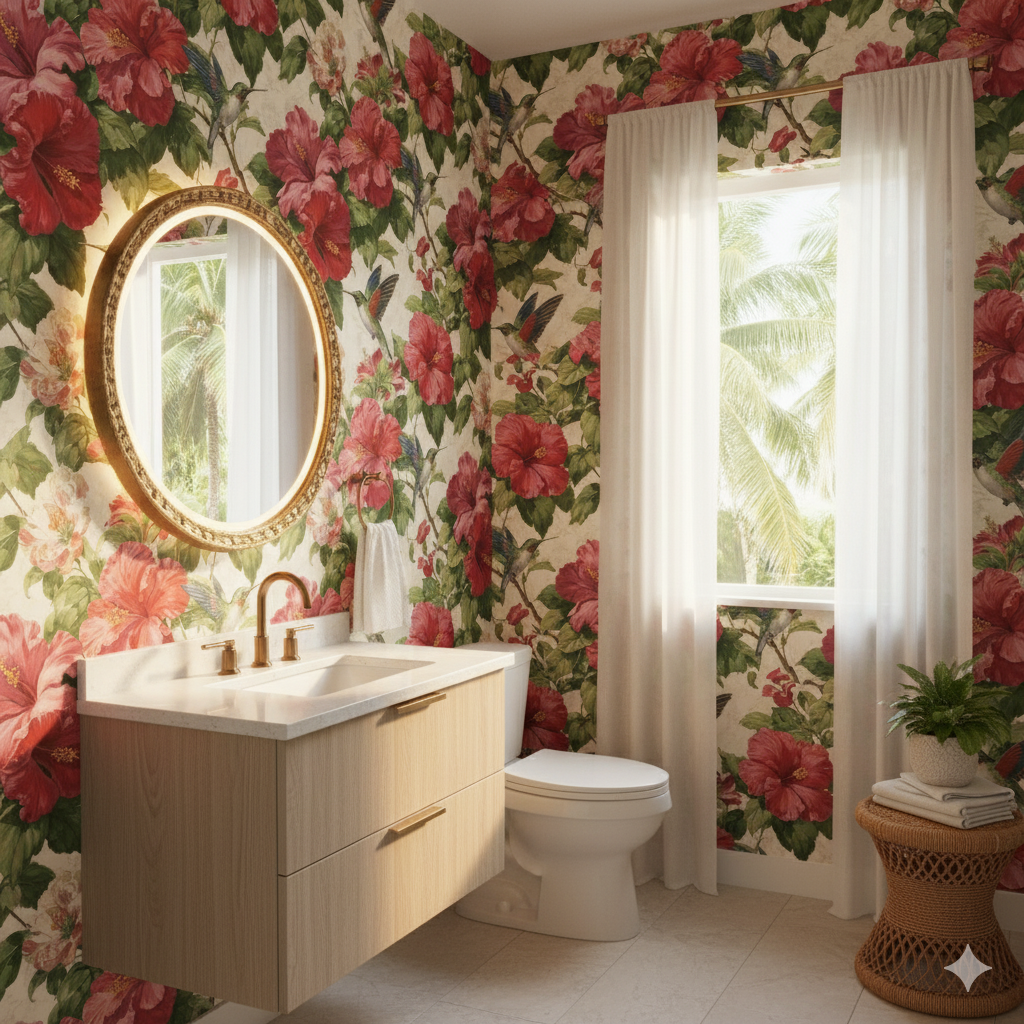 Oversized hibiscus blossoms in saturated shades of scarlet, blush, and coral bloom alongside lush green leaves. Hummingbirds, painted with iridescent teal and ruby feathers, hover gracefully among the flowers, bringing life and vibrancy to the design. The cream background softens the palette, allowing the rich reds and greens to take center stage. This tropical-inspired wallpaper is perfect for bold feature walls in dining rooms, sunrooms, or boutique hotel suites. Its lush vibrancy pairs well with rattan furniture, dark woods, or bohemian décor accents, instantly transporting interiors to a tropical escape.