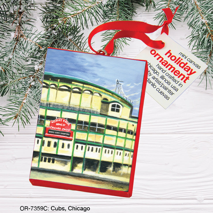 Cubs, Chicago, Ornament (OR-7359C) is made in the USA from oil paintings by artist, Danilo Cuevas. Miniaturized images mounted on a mini canvas. Each arrive with a red ribbon strand for easy hanging and display.
