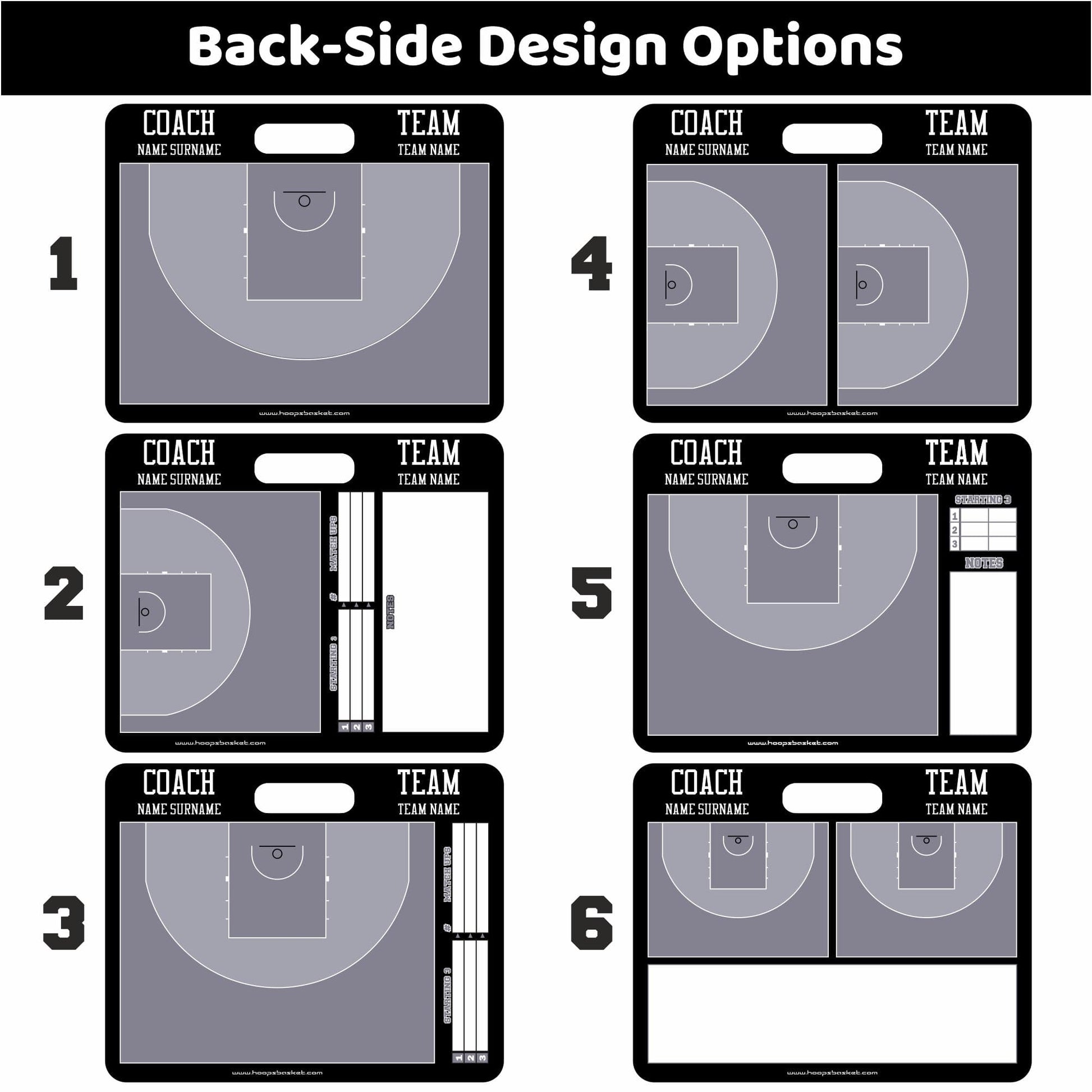 There are 6 different options for the back-side of your coaching board. Please keep in mind that all coaching boards are customizable, both the front and the back sides of the basketball clipboard.
