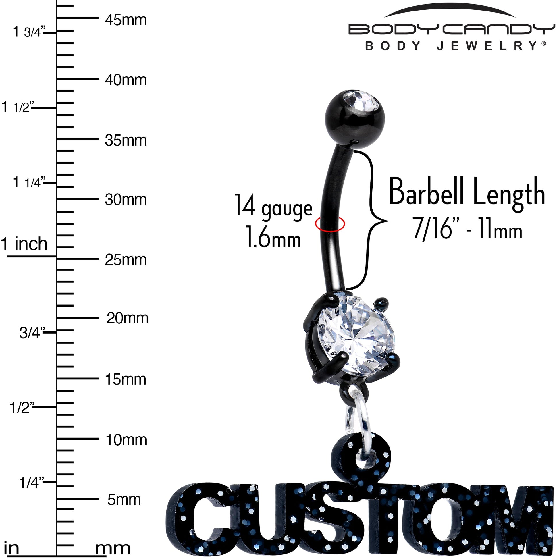 Take your gift giving to the next level when you personalize this stunning custom dangle belly ring. This customizable belly ring is made with a 14 gauge stainless steel curved barbell and features a clear top and bottom accent as well as an acrylic dangle charm that can fit your personal message up to eight characters in length.