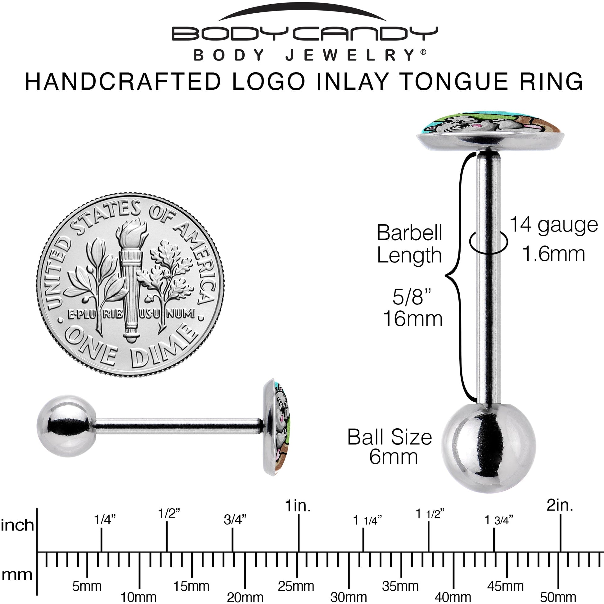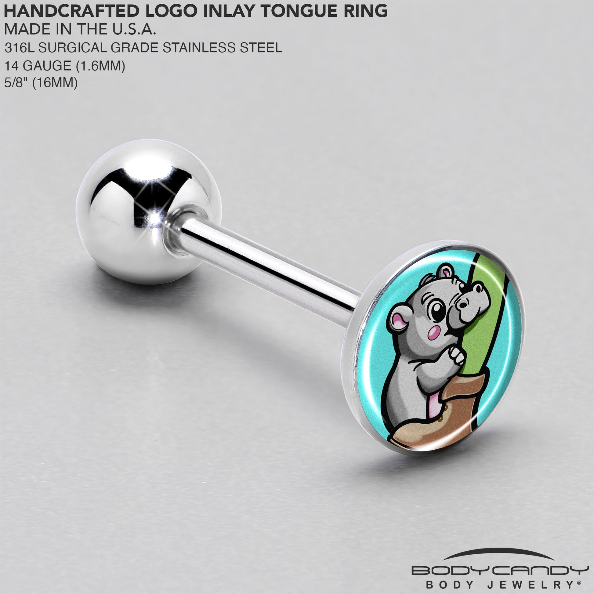 Get yourself a hippo hug when you're rocking this 14 gauge tongue jewelry. It's made with a 5/8 inch 316L surgical grade stainless steel straight barbell with a 6mm bottom ball end. The top end features a disc logo charm with a blue background. Front and center is that adorable baby hippo from the internet video, biting its keeper's leg. You'll be ready to take a bite out of style when you're rocking this mouthy baby hippopotamus tongue piercing ring.Specifications