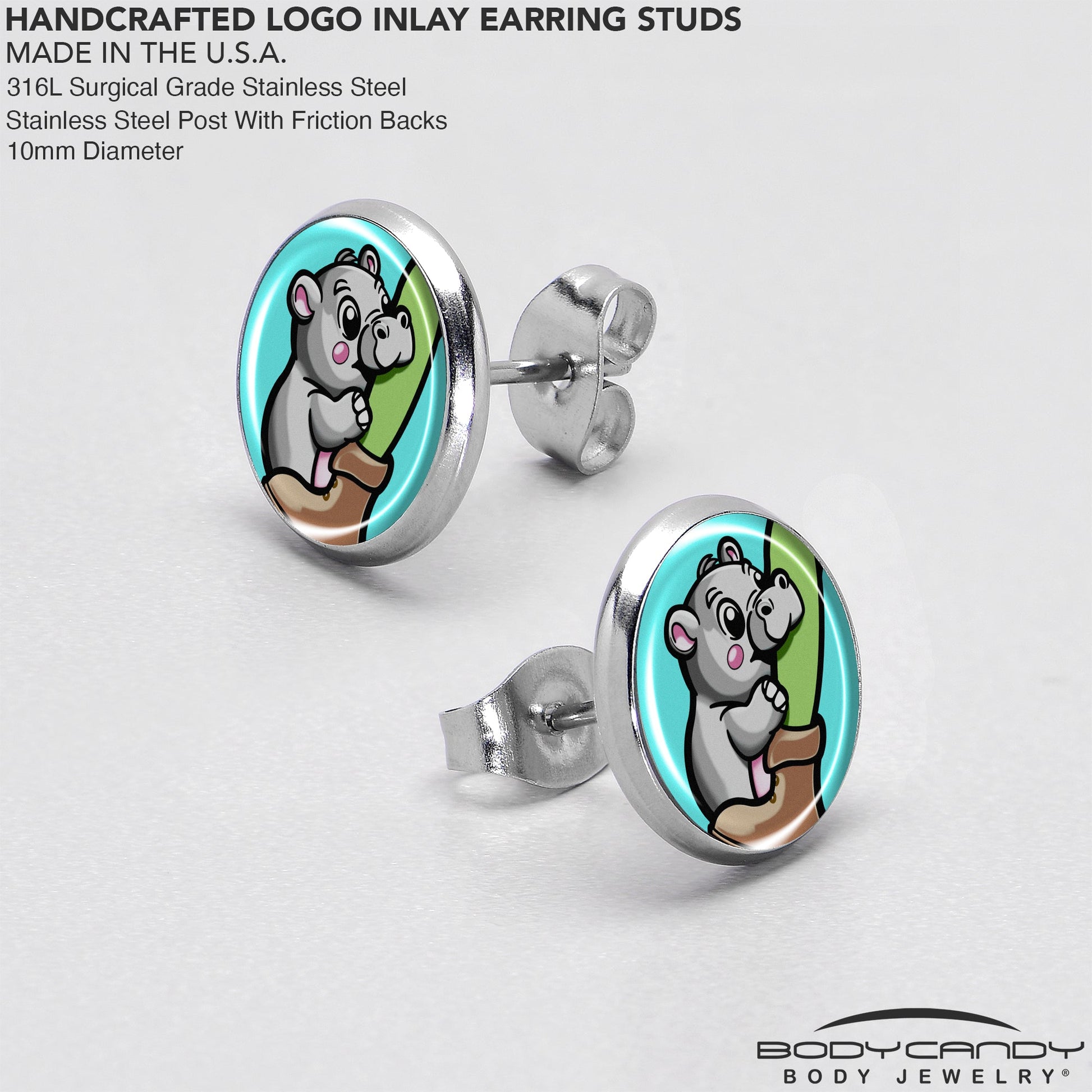 Approximately 10mm Diameter, Stainless Steel Post with Friction Backs, Pierced Earrings, Logo Inlay