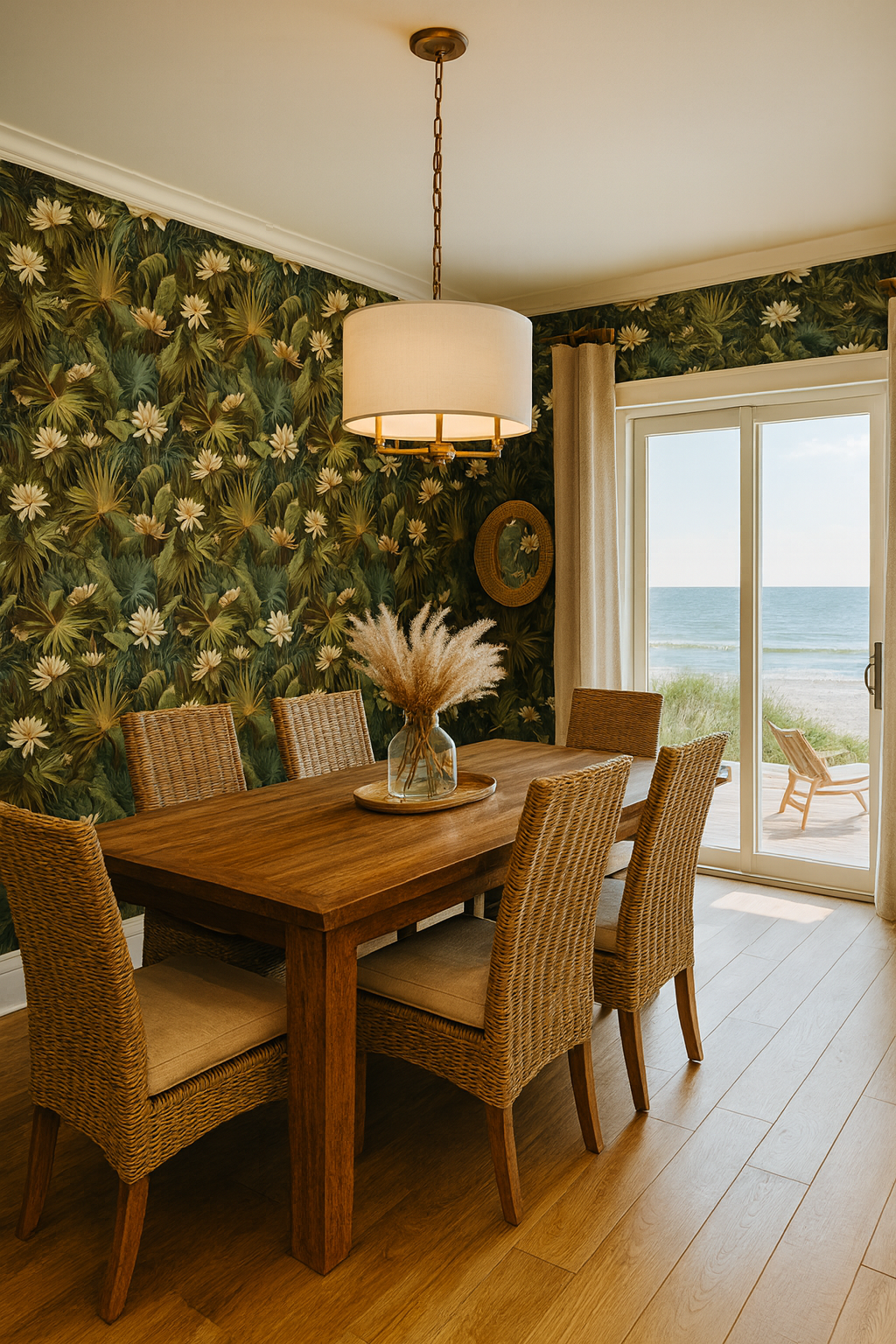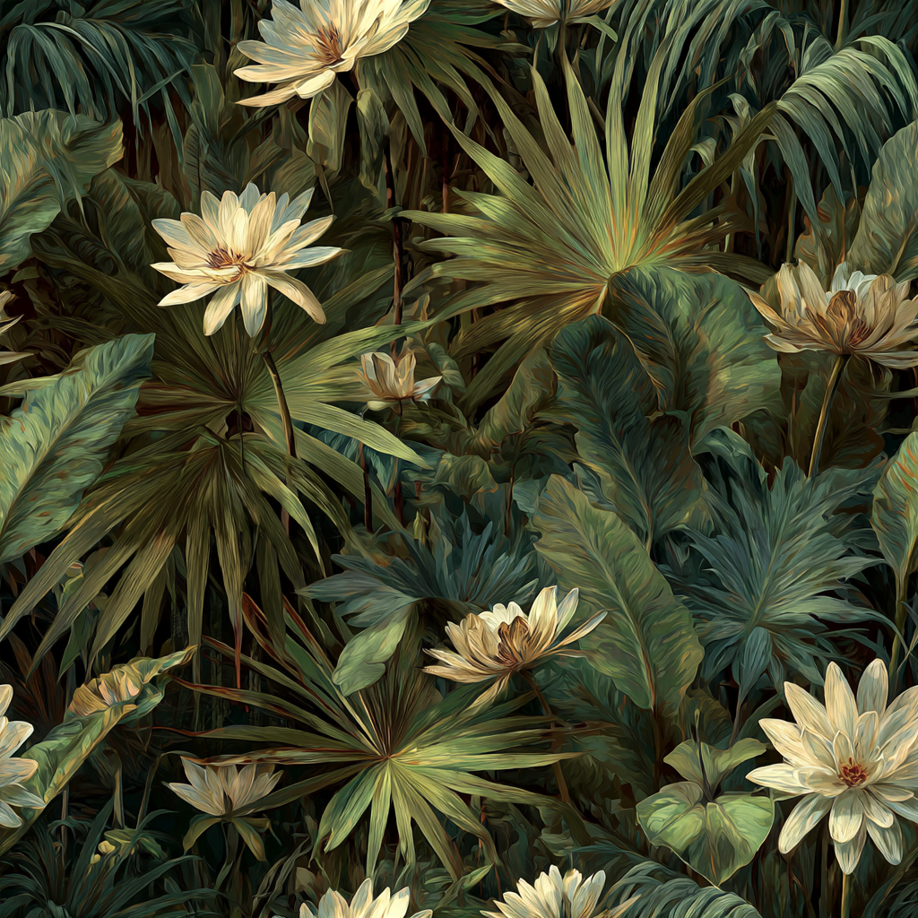 Deep greens dominate this lush wallpaper, with fan palms and layered swamp foliage accented by pale yellow water lilies. The rich composition creates an enveloping jungle atmosphere that feels immersive, almost cinematic. Ideal for powder rooms, dining rooms, or dramatic living spaces, it brings a tropical decadence that works well with both dark, moody interiors and natural wood finishes. The intricate leaves and blooms give a painterly realism that is luxurious without being overwhelming, perfect for homeowners seeking a statement piece that feels exotic and grounding at the same time.